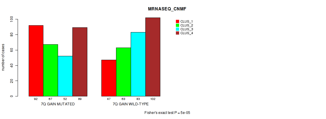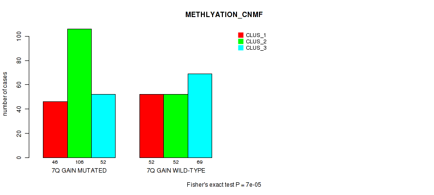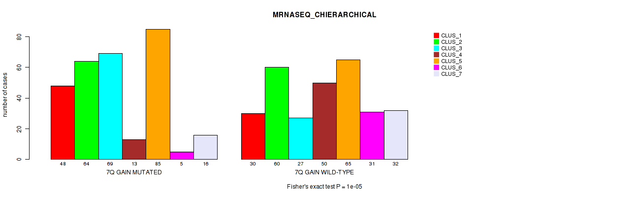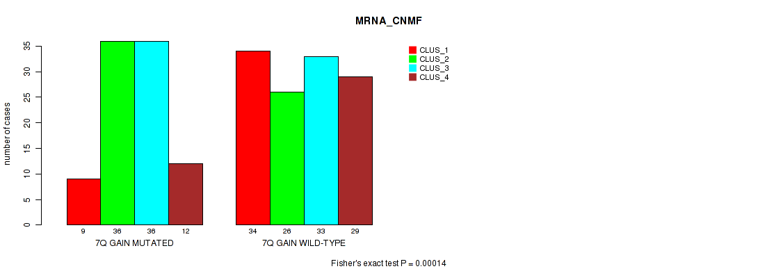 7q gain cnv correlated to 'MRNA_CNMF', 'MRNA_CHIERARCHICAL', 'CN_CNMF', 'METHLYATION_CNMF', 'MRNASEQ_CNMF', and 'MRNASEQ_CHIERARCHICAL'.