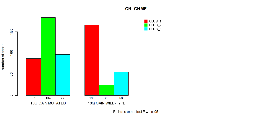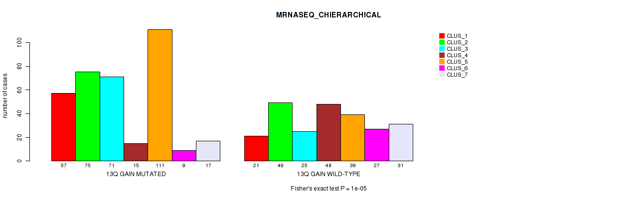 13q gain cnv correlated to 'MRNA_CNMF', 'MRNA_CHIERARCHICAL', 'CN_CNMF', 'METHLYATION_CNMF', 'MRNASEQ_CNMF', and 'MRNASEQ_CHIERARCHICAL'.