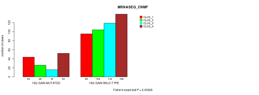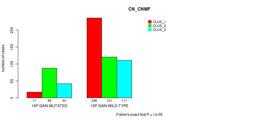 16p gain cnv correlated to 'CN_CNMF', 'MRNASEQ_CNMF', and 'MRNASEQ_CHIERARCHICAL'.