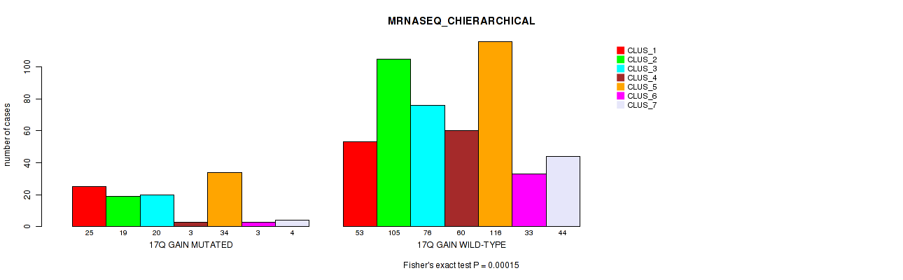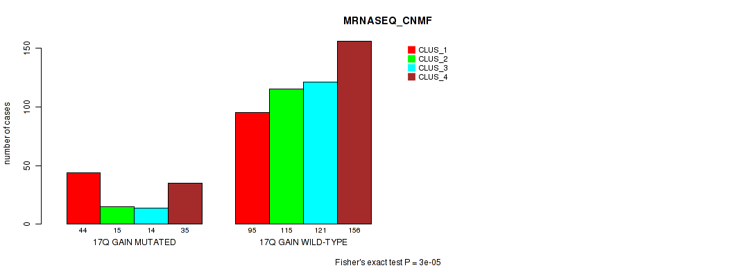 17q gain cnv correlated to 'CN_CNMF', 'MRNASEQ_CNMF', and 'MRNASEQ_CHIERARCHICAL'.