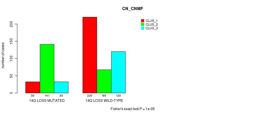 14q loss cnv correlated to 'MRNA_CNMF', 'MRNA_CHIERARCHICAL', 'CN_CNMF', 'METHLYATION_CNMF', 'MRNASEQ_CNMF', and 'MRNASEQ_CHIERARCHICAL'.