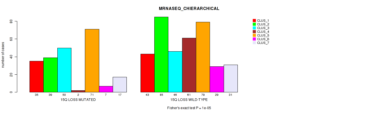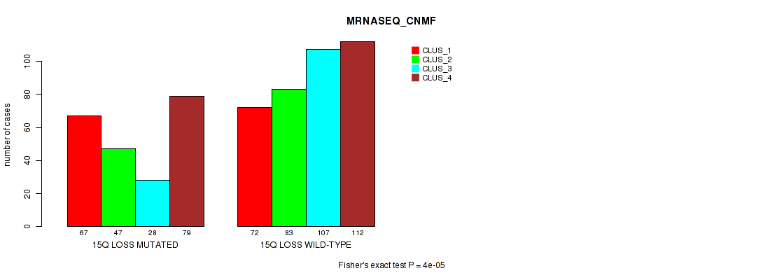 15q loss cnv correlated to 'MRNA_CNMF', 'CN_CNMF', 'MRNASEQ_CNMF', and 'MRNASEQ_CHIERARCHICAL'.