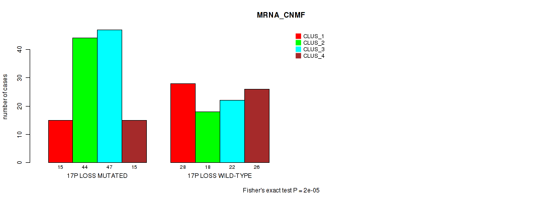 17p loss cnv correlated to 'MRNA_CNMF', 'MRNA_CHIERARCHICAL', 'CN_CNMF', 'METHLYATION_CNMF', 'MRNASEQ_CNMF', and 'MRNASEQ_CHIERARCHICAL'.