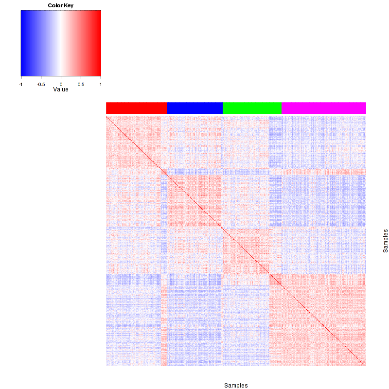 Figure 1.  Get High-res Image Samples were separated into 4 clusters. Shown are 606 samples and 1200 marker genes. The color bar of the row indicates the marker genes for the corresponding cluster.