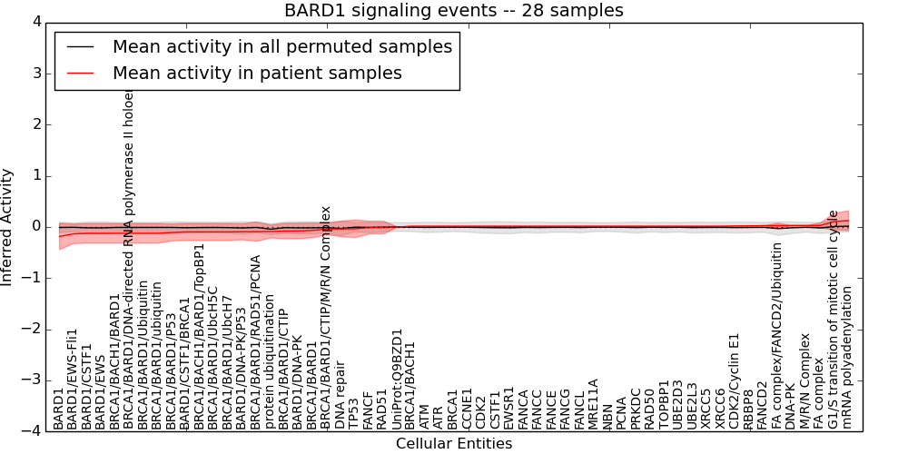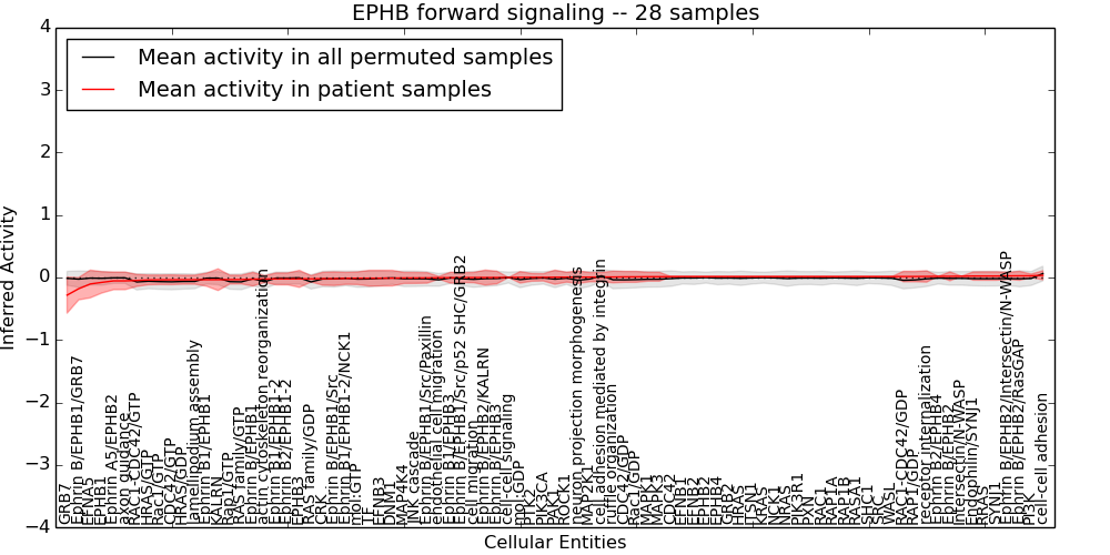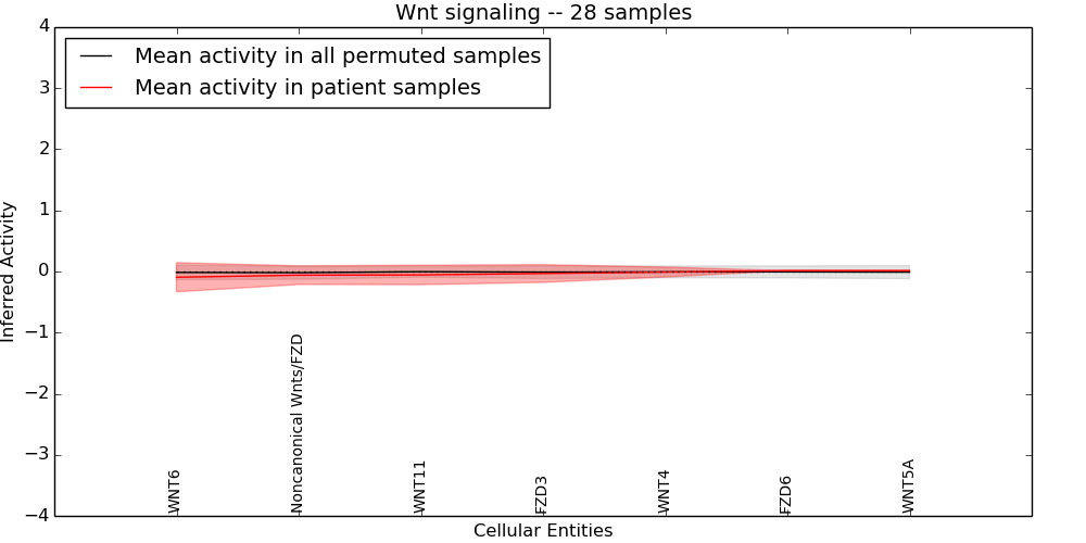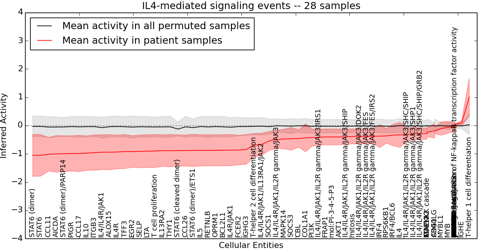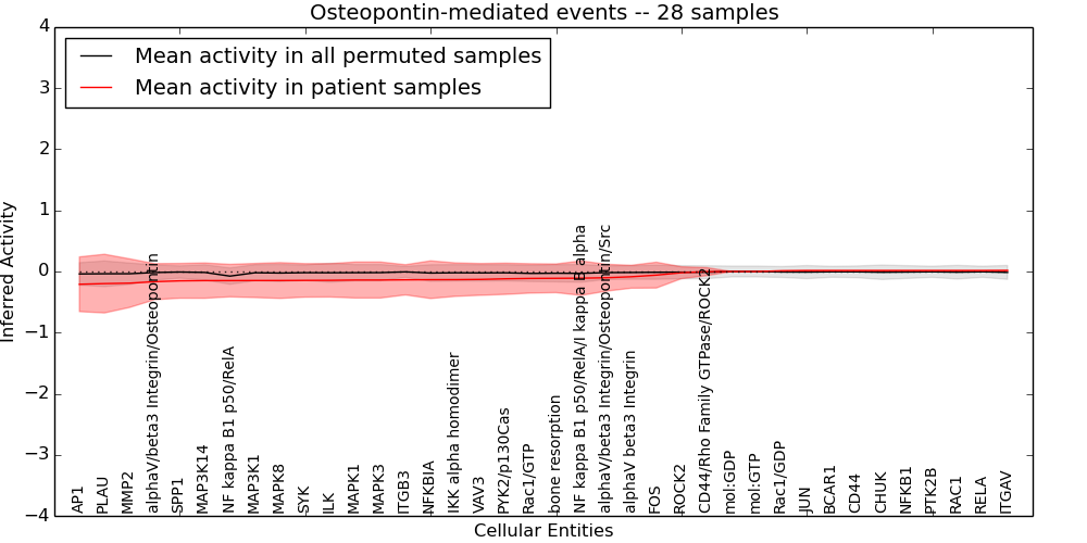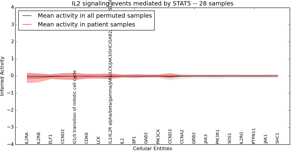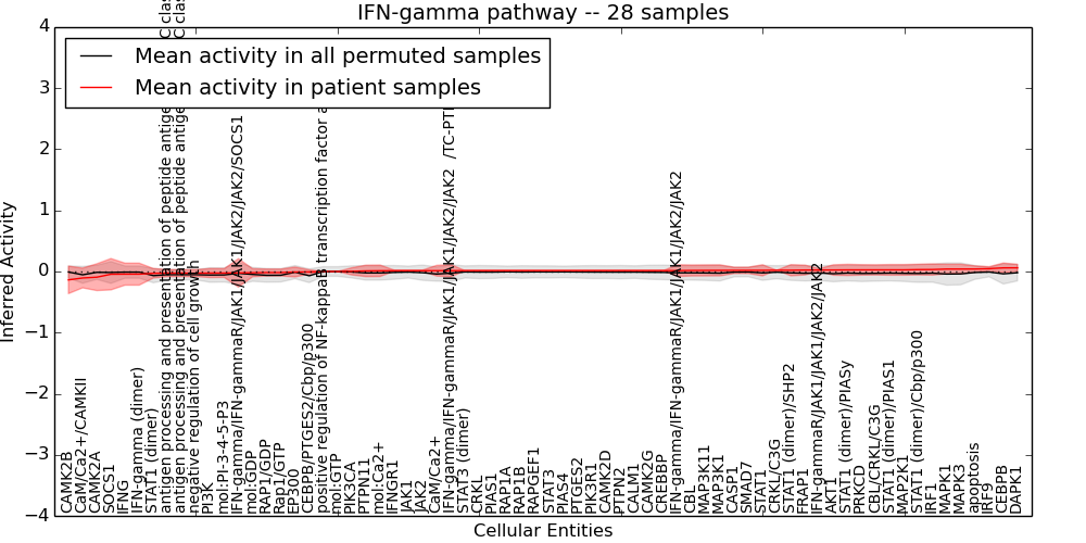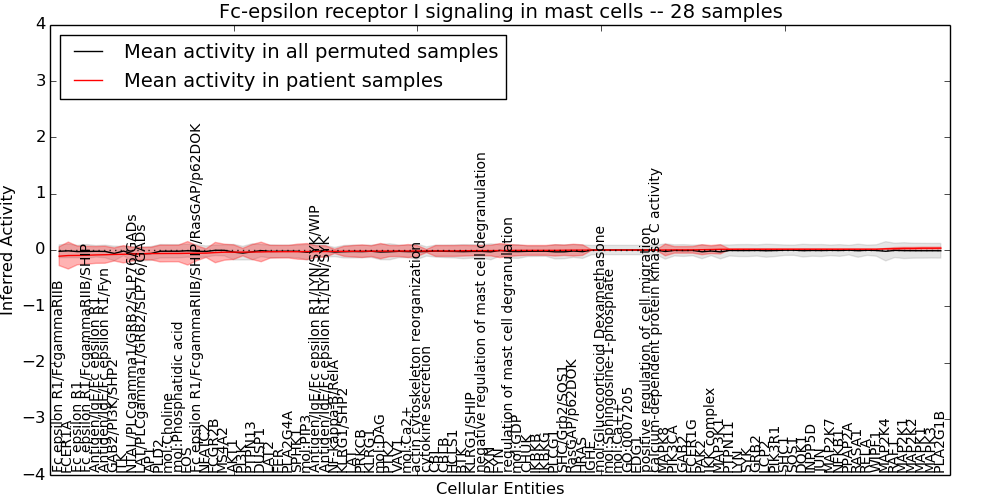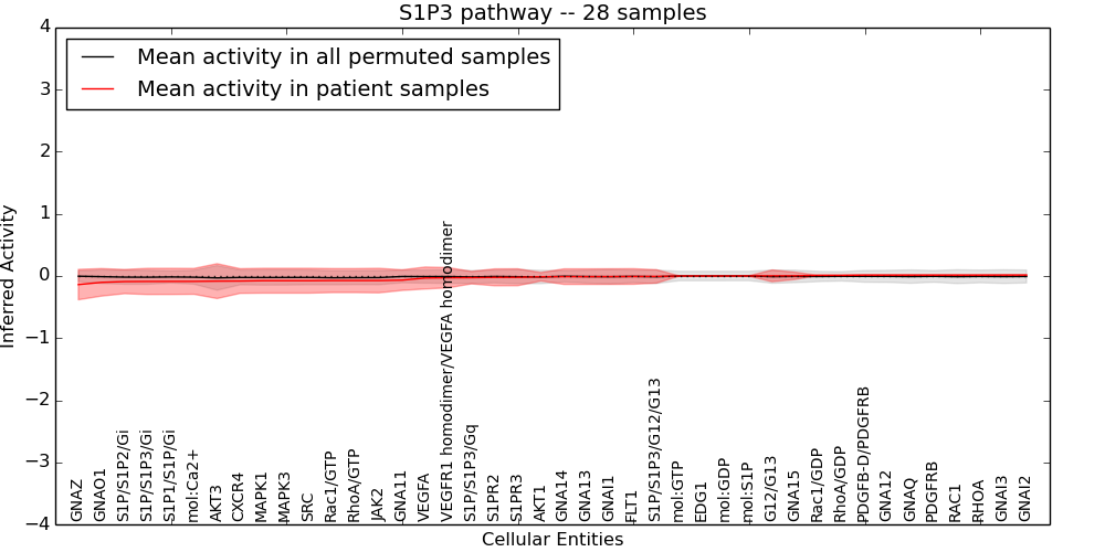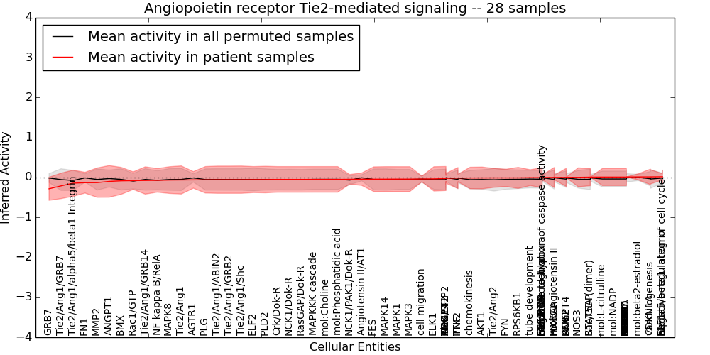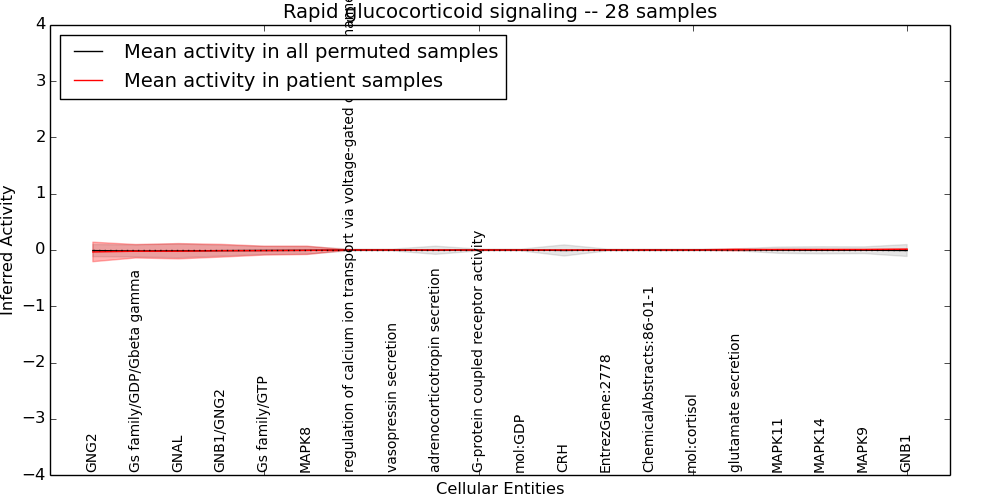 Figure S131.  Get High-res Image This plot shows pathway concept perturbations across all samples against a permutation model. The concepts along the x-axis are sorted by lowest to highest mean activity for the real patient samples. Mean inferred activities are plotted along the y-axis as a colored band showing the average level and one standard deviation range. Real samples are shown in red and permuted samples in black.