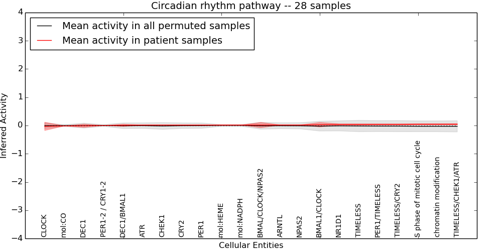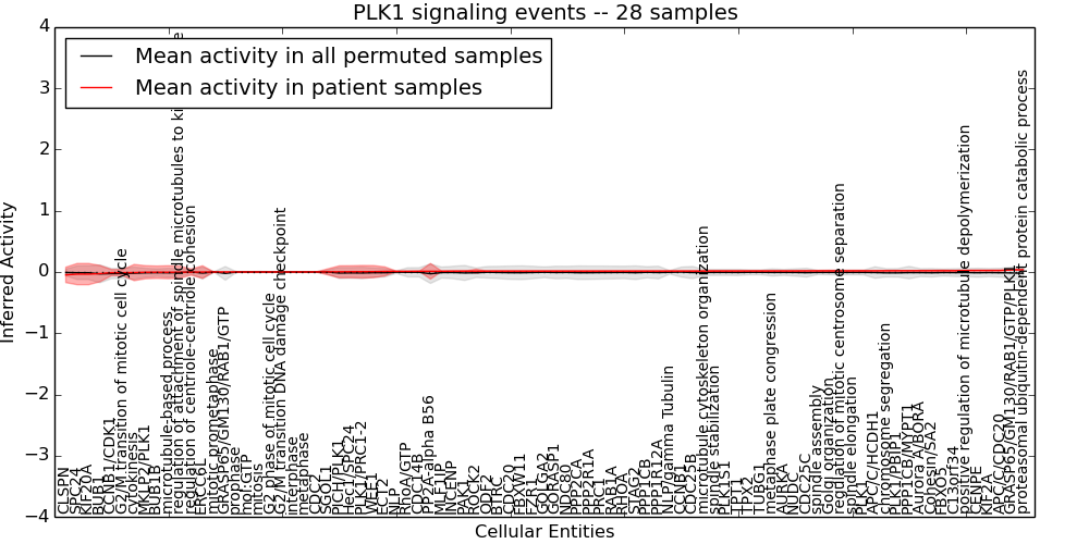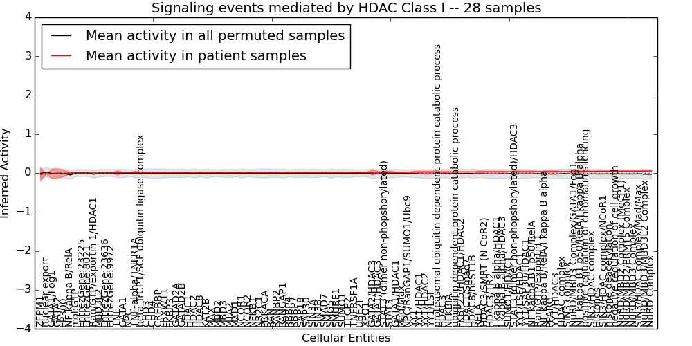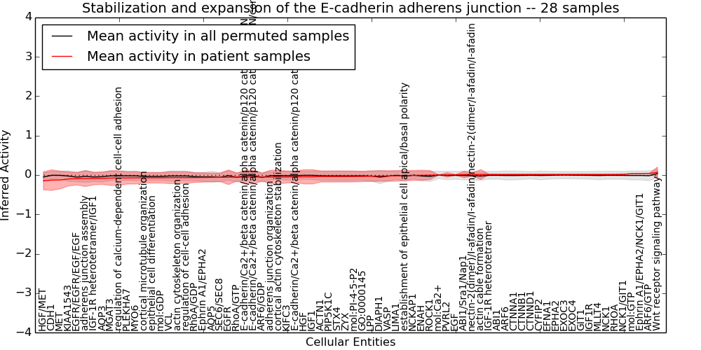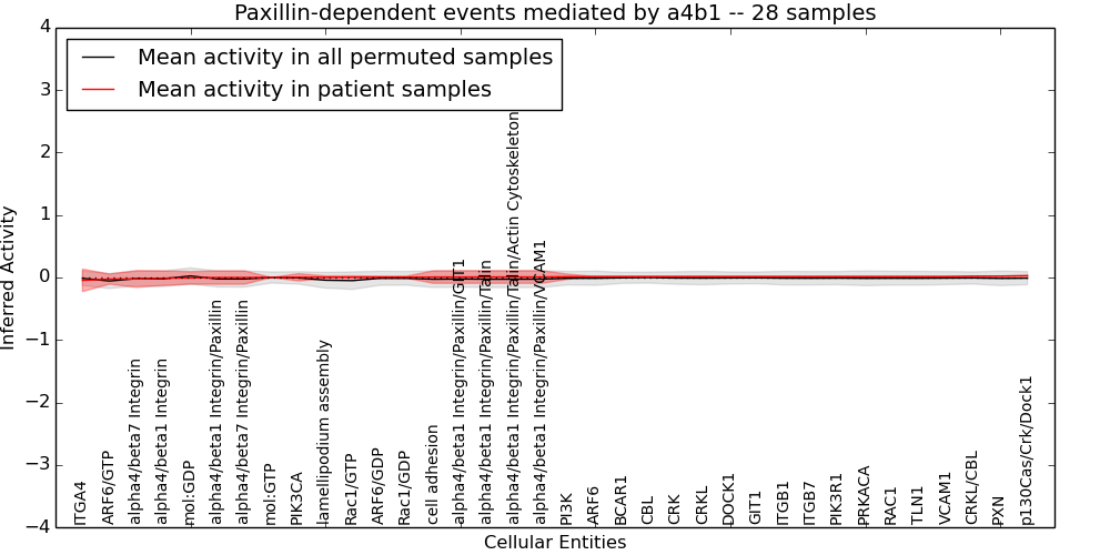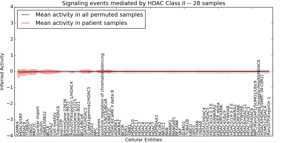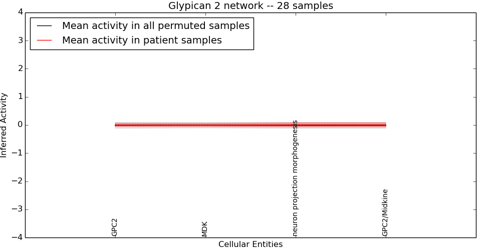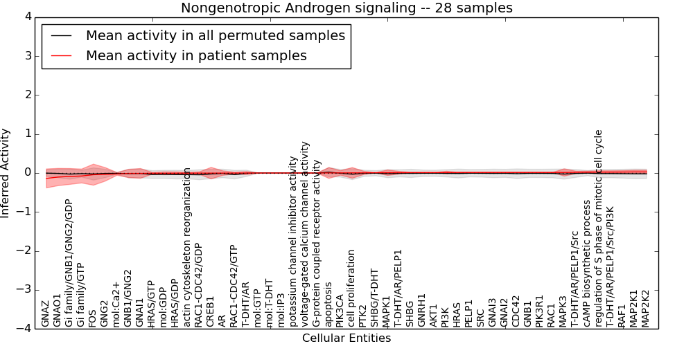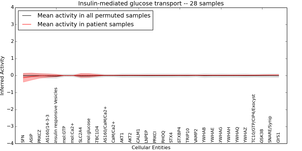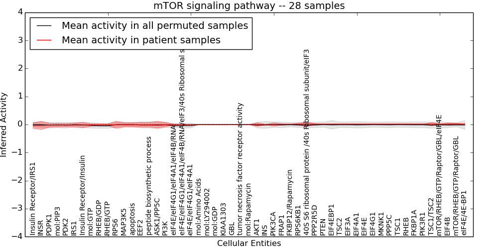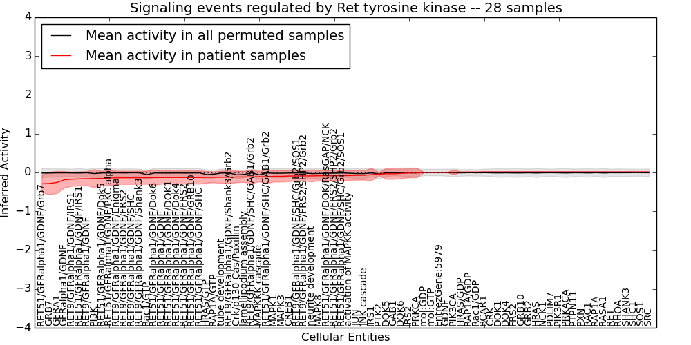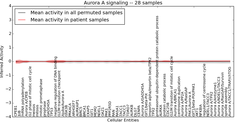 Figure S131.  Get High-res Image This plot shows pathway concept perturbations across all samples against a permutation model. The concepts along the x-axis are sorted by lowest to highest mean activity for the real patient samples. Mean inferred activities are plotted along the y-axis as a colored band showing the average level and one standard deviation range. Real samples are shown in red and permuted samples in black.