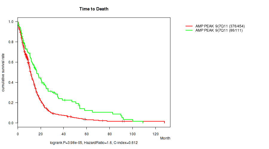 Table S3. Gene #9: 'amp_7q11.21' versus Clinical Feature #1: 'Time to Death'