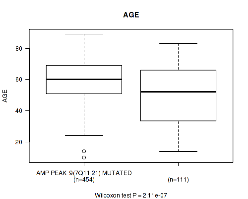 Table S4. Gene #9: 'amp_7q11.21' versus Clinical Feature #2: 'AGE'