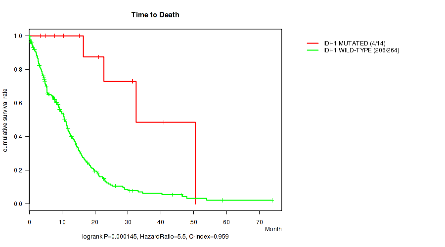 IDH1 mutation correlated to 'Time to Death' and 'AGE'.