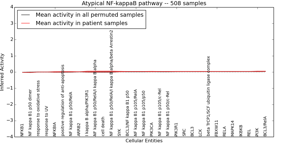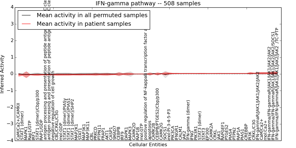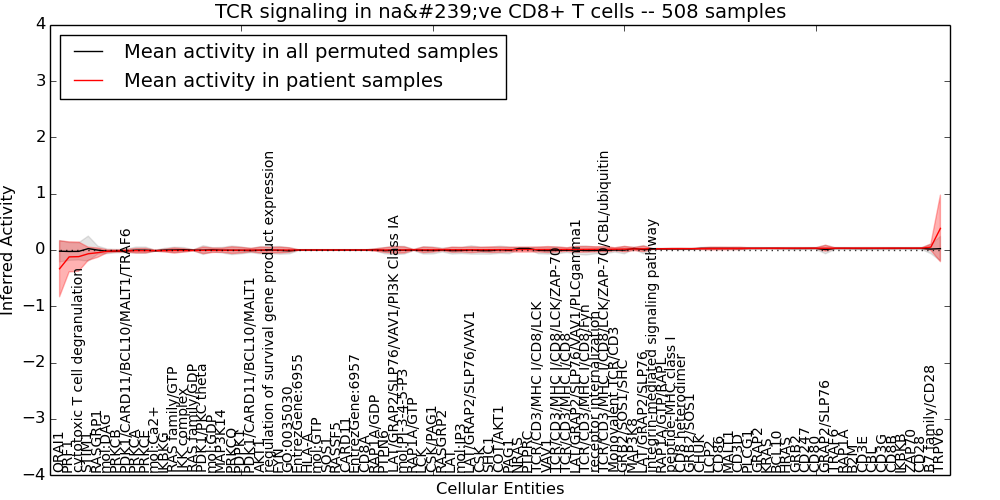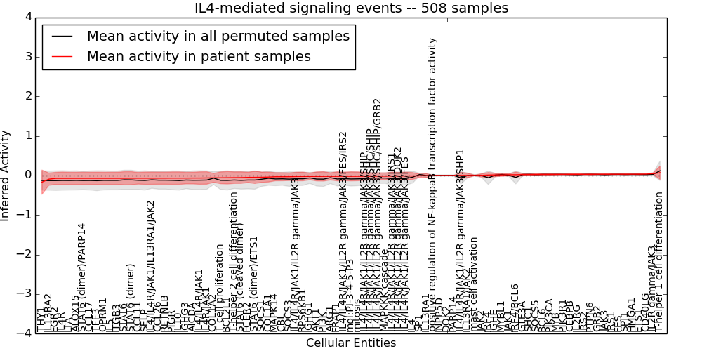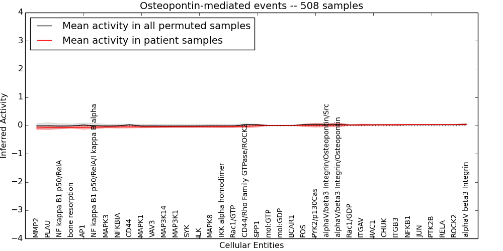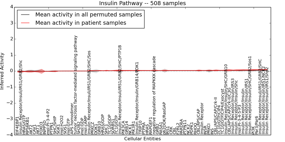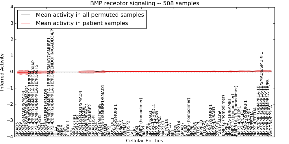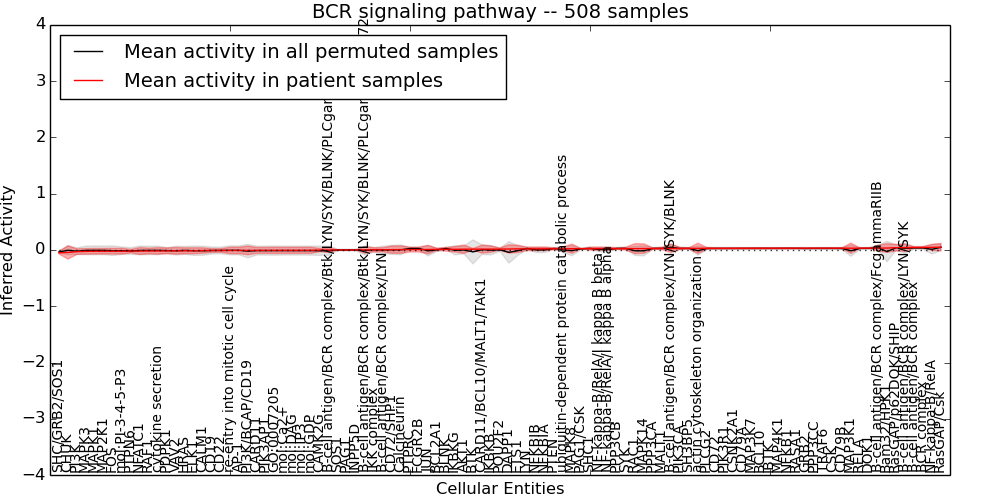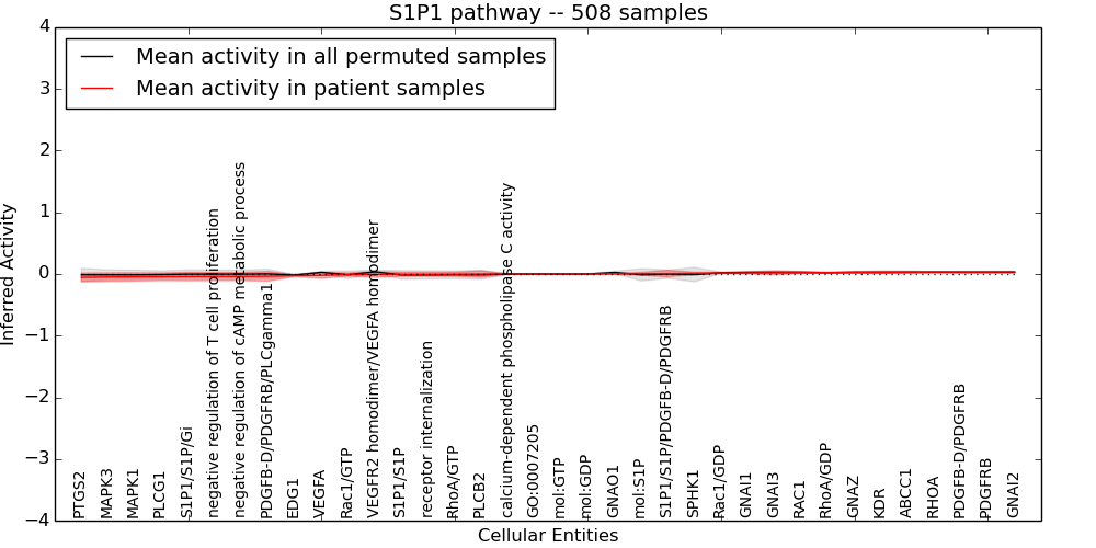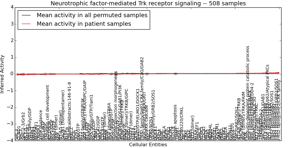 Figure S128. Get High-res Image This plot shows pathway concept perturbations across all samples against a permutation model. The concepts along the x-axis are sorted by lowest to highest mean activity for the real patient samples. Mean inferred activities are plotted along the y-axis as a colored band showing the average level and one standard deviation range. Real samples are shown in red and permuted samples in black.