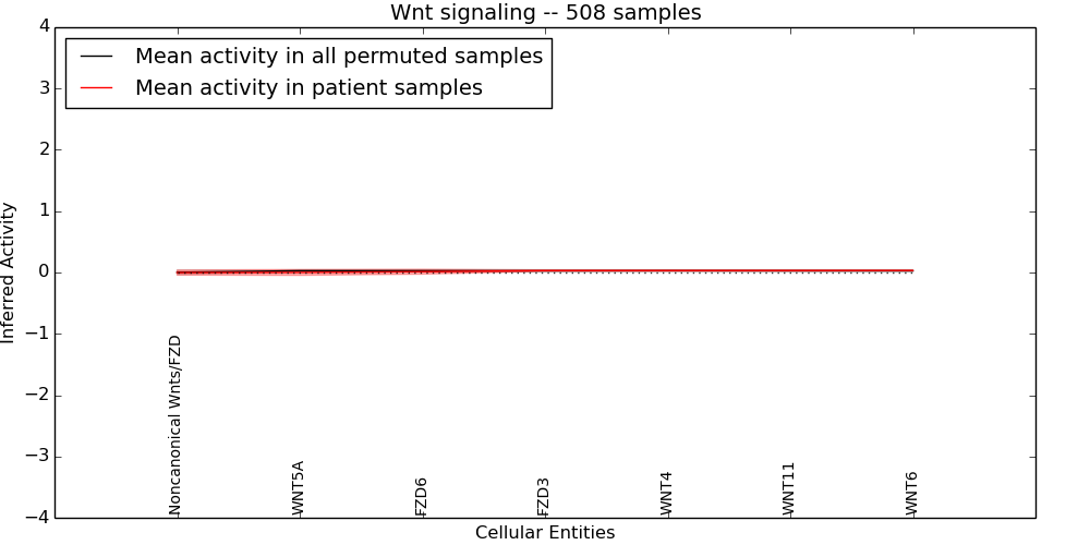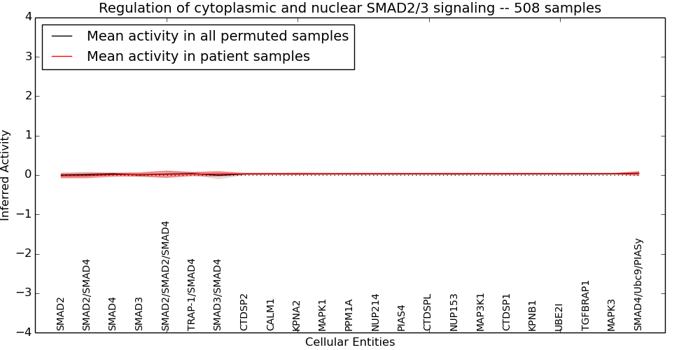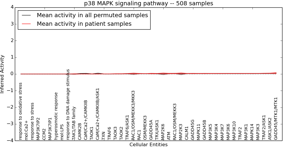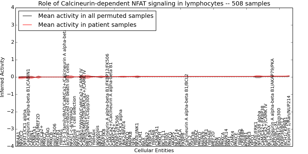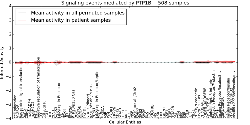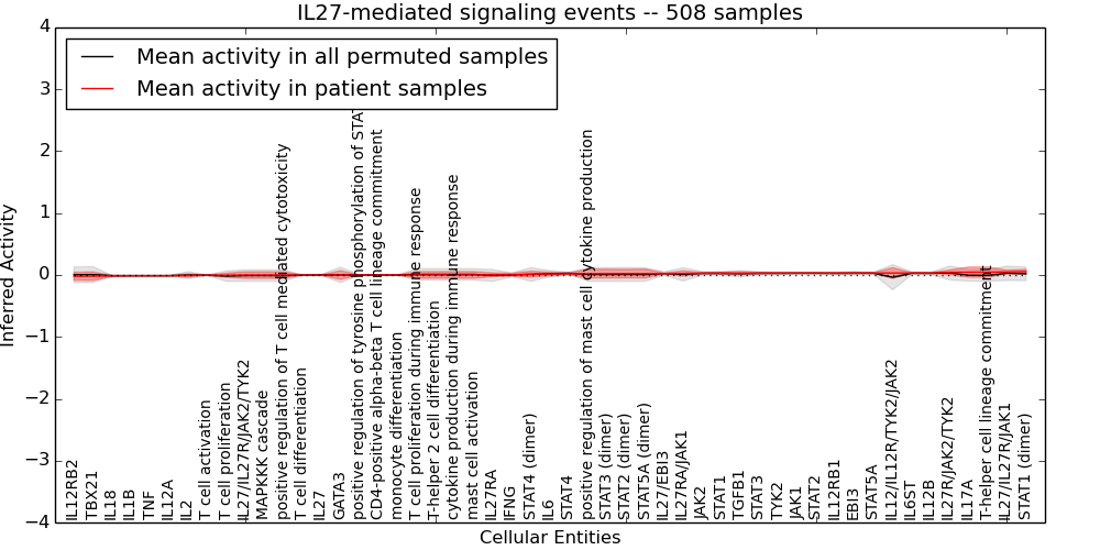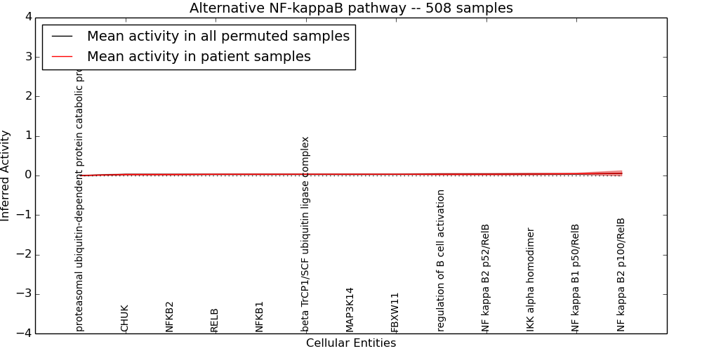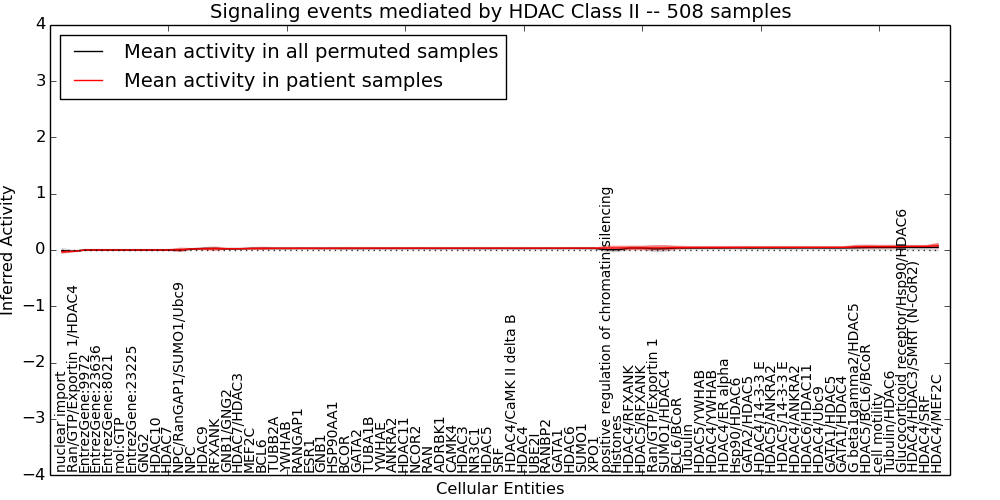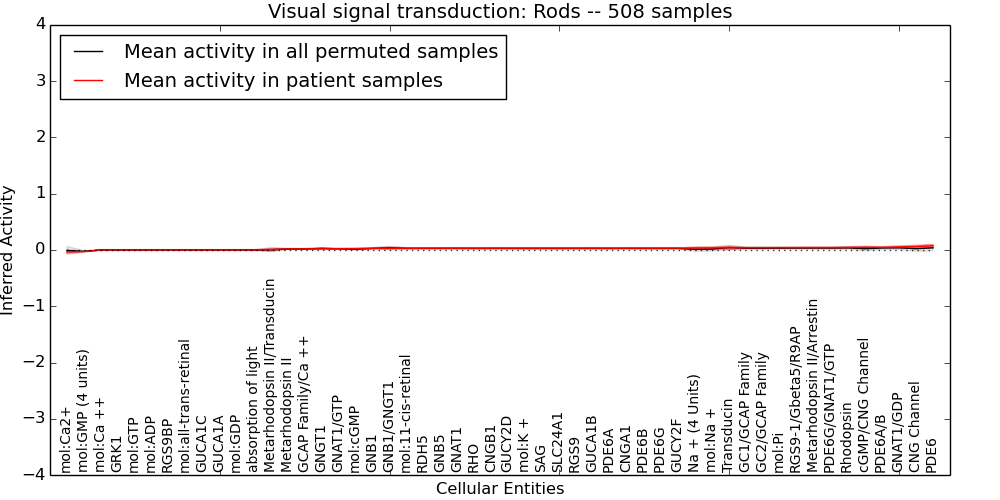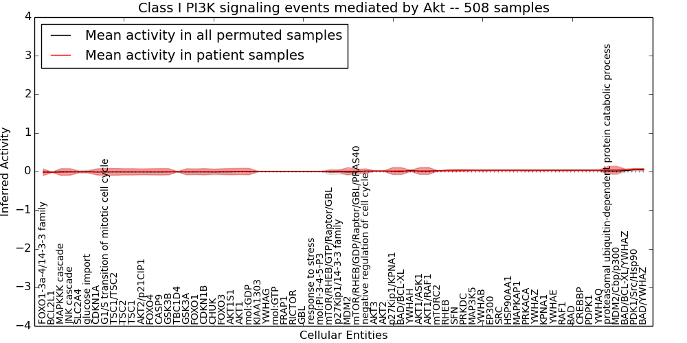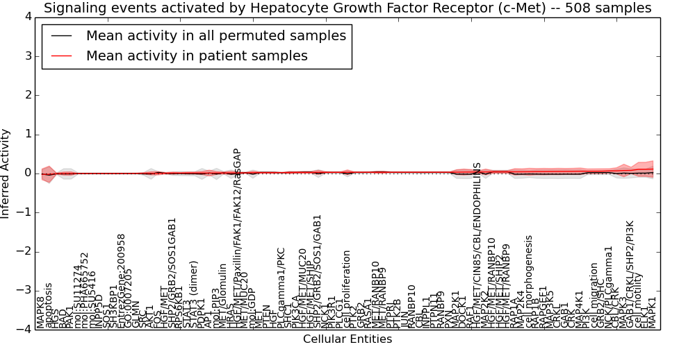 Figure S128. Get High-res Image This plot shows pathway concept perturbations across all samples against a permutation model. The concepts along the x-axis are sorted by lowest to highest mean activity for the real patient samples. Mean inferred activities are plotted along the y-axis as a colored band showing the average level and one standard deviation range. Real samples are shown in red and permuted samples in black.