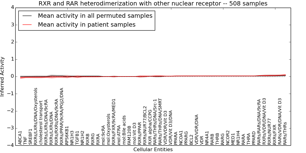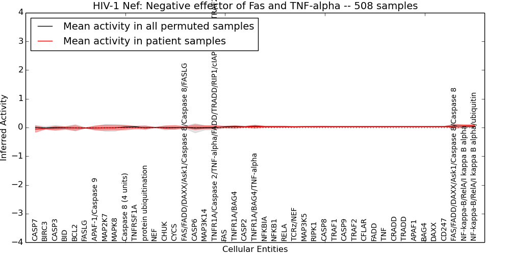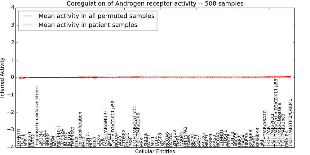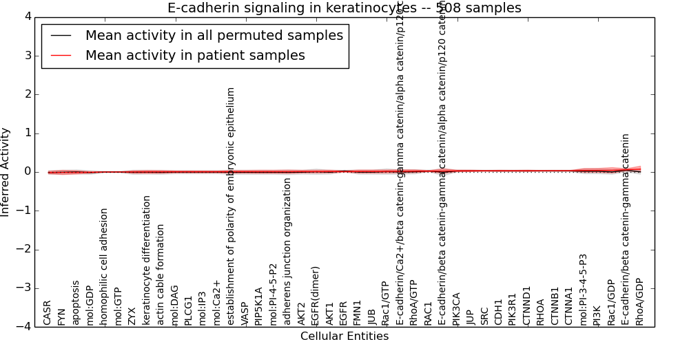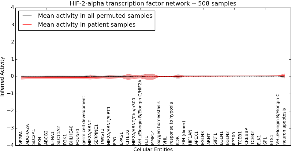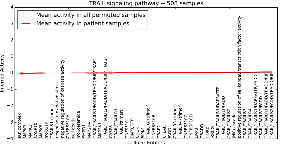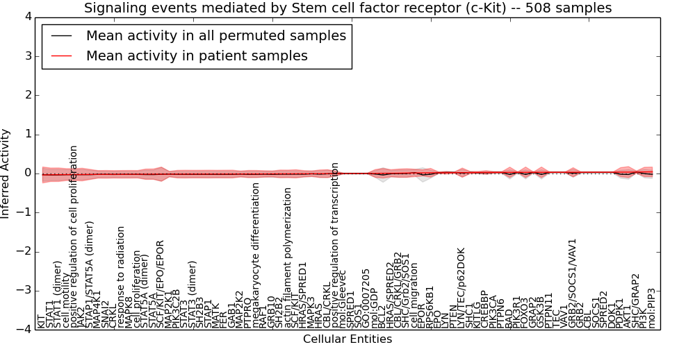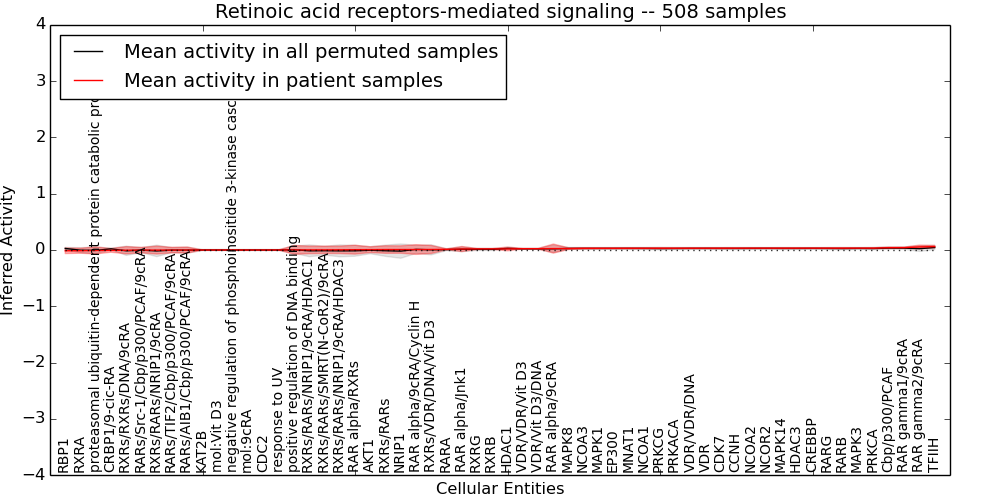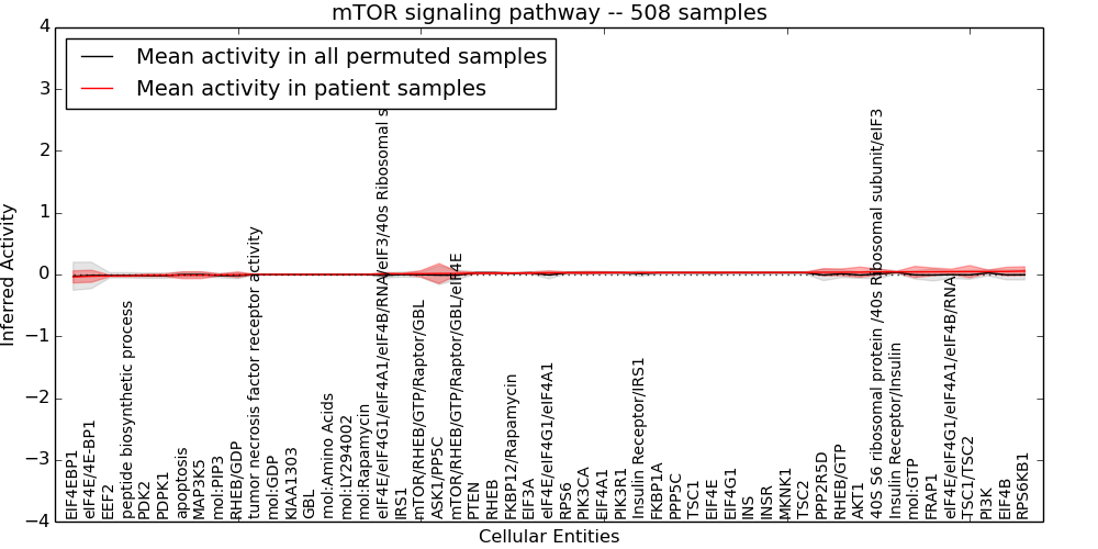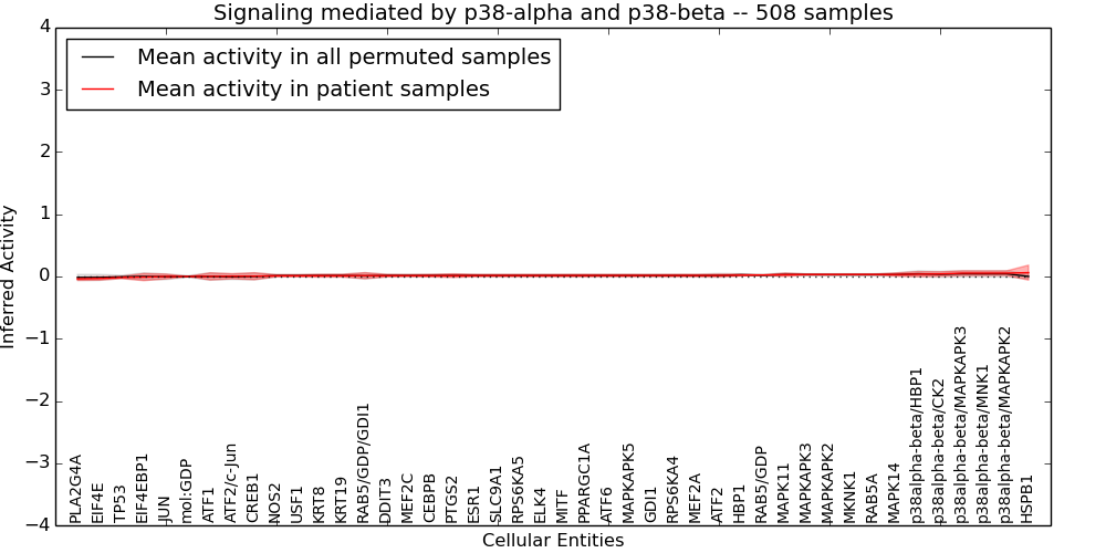 Figure S128. Get High-res Image This plot shows pathway concept perturbations across all samples against a permutation model. The concepts along the x-axis are sorted by lowest to highest mean activity for the real patient samples. Mean inferred activities are plotted along the y-axis as a colored band showing the average level and one standard deviation range. Real samples are shown in red and permuted samples in black.