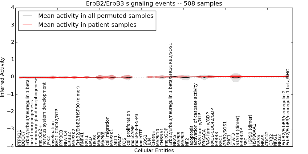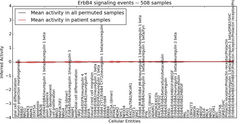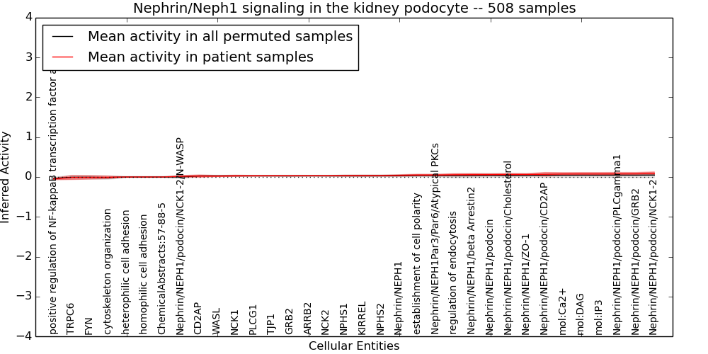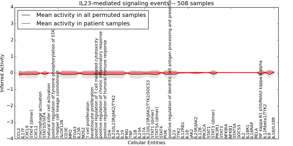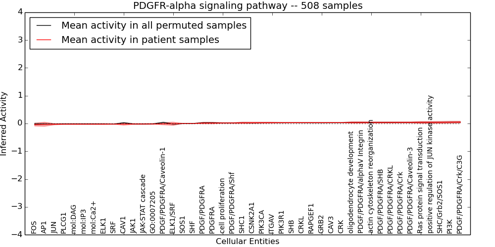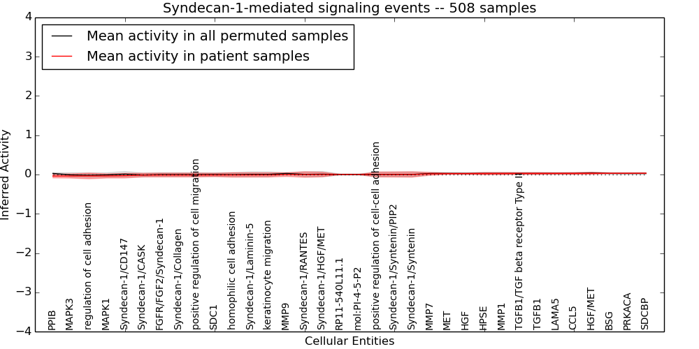 Figure S131. Get High-res Image This plot shows pathway concept perturbations across all samples against a permutation model. The concepts along the x-axis are sorted by lowest to highest mean activity for the real patient samples. Mean inferred activities are plotted along the y-axis as a colored band showing the average level and one standard deviation range. Real samples are shown in red and permuted samples in black.