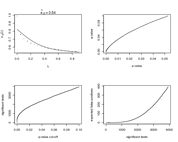 Figure 2. Plot 1. The estimated pi_0 versus the tuning parameter lambda. Plot 2. The q-values versus the p-values. Plot 3. The number of significant tests versus each q-value cutoff. Plot 4. The number of expected false positives versus the number of significant tests.The first is a plot of the estimate of pi_0 versus its tuning parameter lambda. In most cases, as lambda gets larger, the bias of the estimate decreases, yet the variance increases. Comparing your estimate of pi_0 to this plot allows one to guage its quality. The remaining three plots show how many tests are significant, as well as how many false positives to expect for each q-value cut-off.