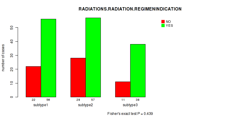 3 subtypes identified in current cancer cohort by 'MIRseq Mature cHierClus subtypes'. These subtypes correlate to 'RADIATIONS.RADIATION.REGIMENINDICATION'.
