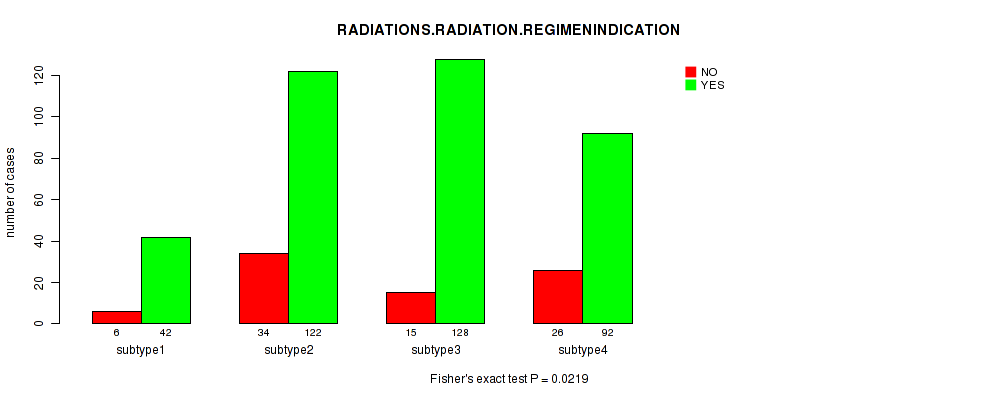 Figure S118. Get High-res Image Clustering Approach #10: 'MIRseq Mature cHierClus subtypes' versus Clinical Feature #9: 'RADIATIONS.RADIATION.REGIMENINDICATION'