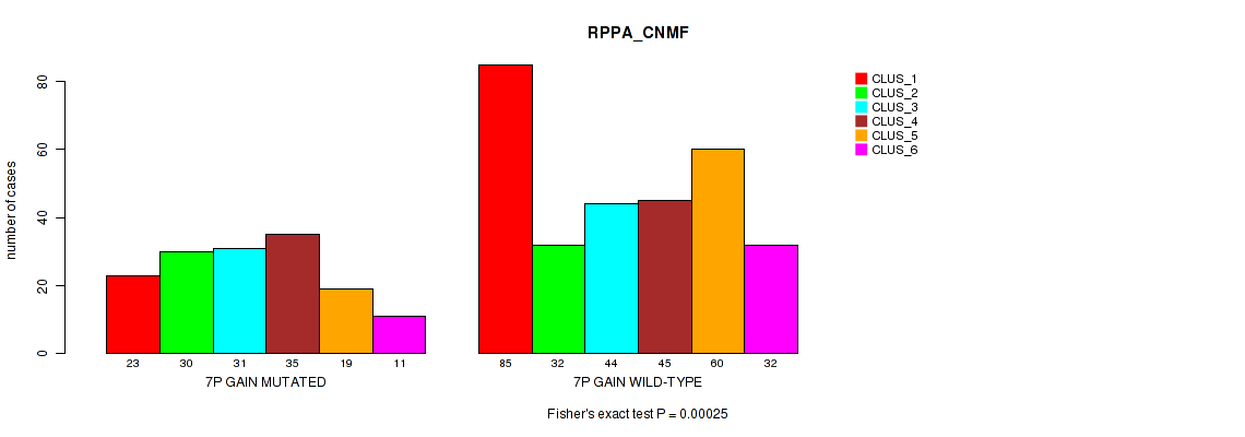 • 7p gain cnv correlated to 'CN_CNMF',  'RPPA_CNMF', and 'MRNASEQ_CNMF'.