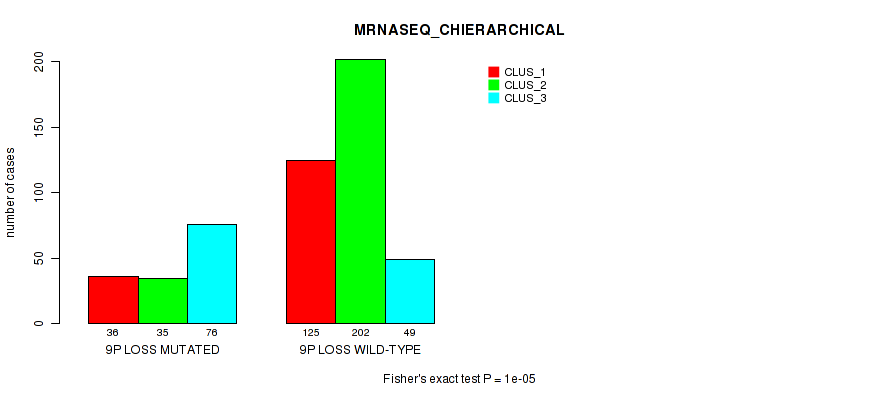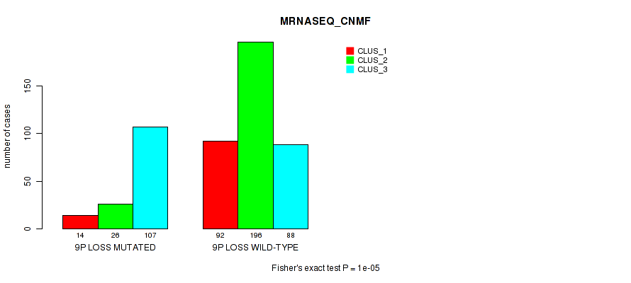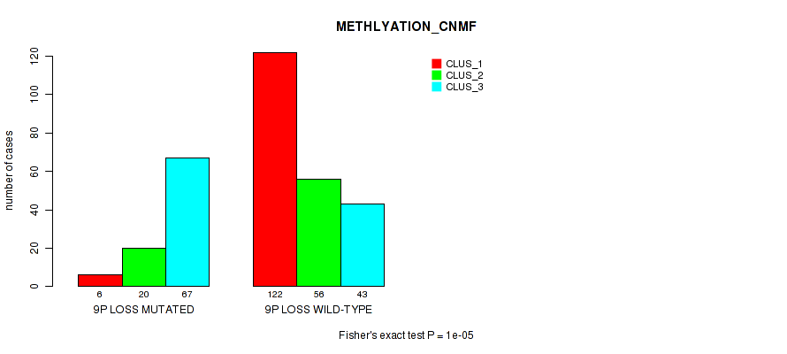 • 9p loss cnv correlated to 'CN_CNMF',  'METHLYATION_CNMF',  'RPPA_CNMF',  'RPPA_CHIERARCHICAL',  'MRNASEQ_CNMF',  'MRNASEQ_CHIERARCHICAL',  'MIRSEQ_CNMF', and 'MIRSEQ_CHIERARCHICAL'.