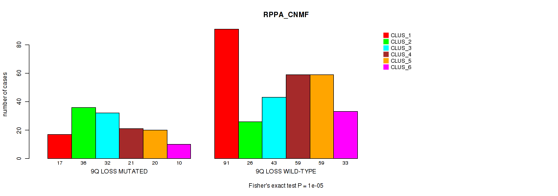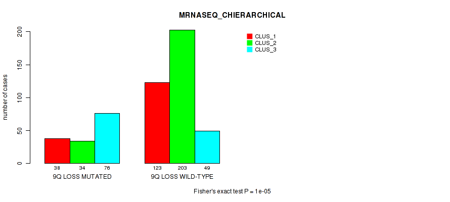 • 9q loss cnv correlated to 'CN_CNMF',  'METHLYATION_CNMF',  'RPPA_CNMF',  'RPPA_CHIERARCHICAL',  'MRNASEQ_CNMF',  'MRNASEQ_CHIERARCHICAL',  'MIRSEQ_CNMF', and 'MIRSEQ_CHIERARCHICAL'.