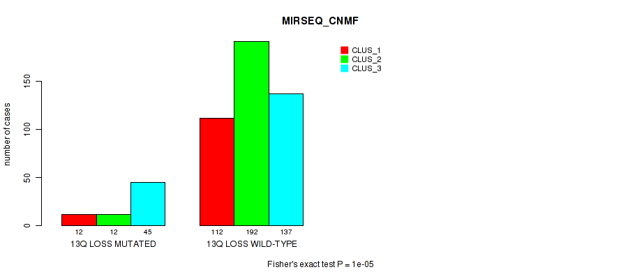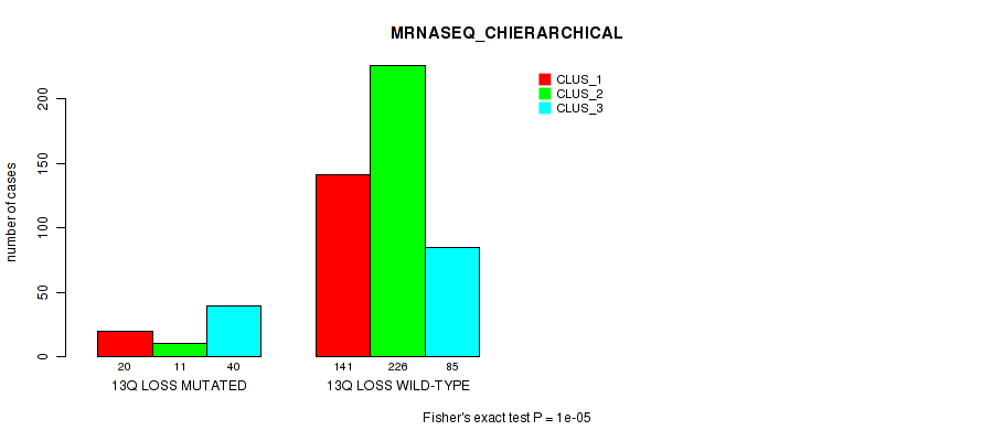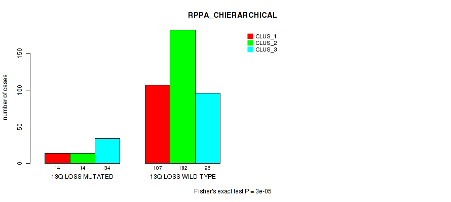 • 13q loss cnv correlated to 'CN_CNMF',  'METHLYATION_CNMF',  'RPPA_CNMF',  'RPPA_CHIERARCHICAL',  'MRNASEQ_CNMF',  'MRNASEQ_CHIERARCHICAL',  'MIRSEQ_CNMF', and 'MIRSEQ_CHIERARCHICAL'.