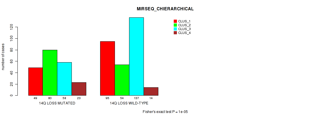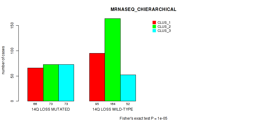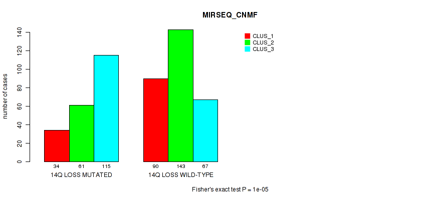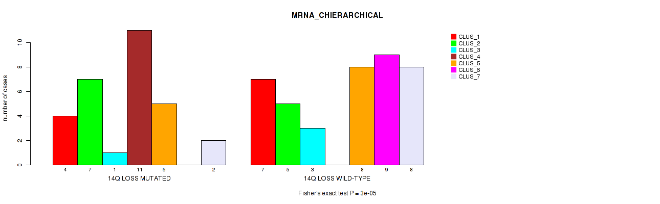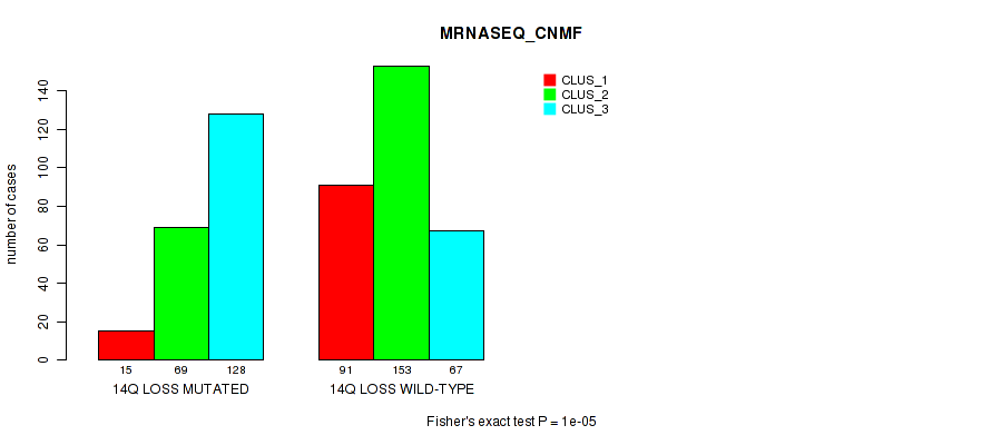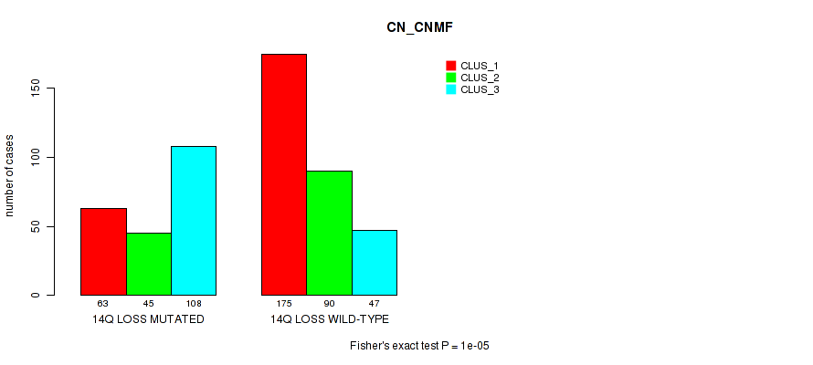 • 14q loss cnv correlated to 'MRNA_CNMF',  'MRNA_CHIERARCHICAL',  'CN_CNMF',  'METHLYATION_CNMF',  'RPPA_CNMF',  'RPPA_CHIERARCHICAL',  'MRNASEQ_CNMF',  'MRNASEQ_CHIERARCHICAL',  'MIRSEQ_CNMF', and 'MIRSEQ_CHIERARCHICAL'.