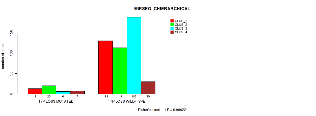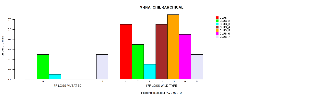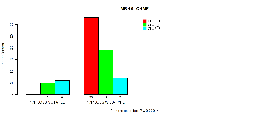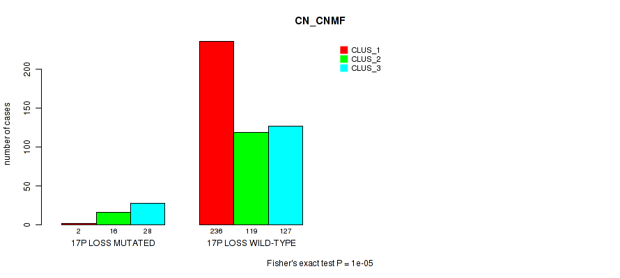 • 17p loss cnv correlated to 'MRNA_CNMF',  'MRNA_CHIERARCHICAL',  'CN_CNMF',  'MRNASEQ_CNMF',  'MRNASEQ_CHIERARCHICAL',  'MIRSEQ_CNMF', and 'MIRSEQ_CHIERARCHICAL'.
