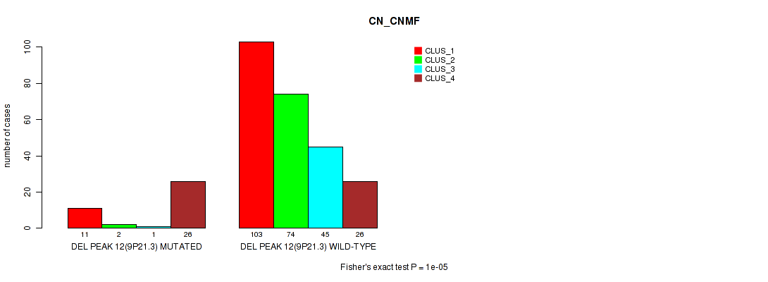 del_9p21.3 cnv correlated to 'CN_CNMF', 'METHLYATION_CNMF', 'RPPA_CHIERARCHICAL', 'MRNASEQ_CNMF', 'MRNASEQ_CHIERARCHICAL', 'MIRSEQ_CNMF', 'MIRSEQ_MATURE_CNMF', and 'MIRSEQ_MATURE_CHIERARCHICAL'.