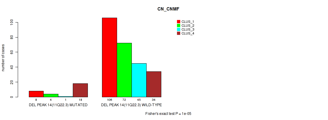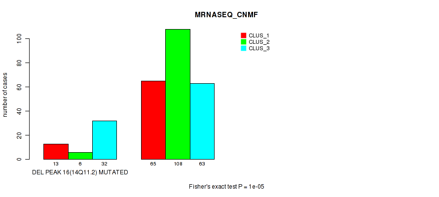 del_14q11.2 cnv correlated to 'CN_CNMF', 'MRNASEQ_CNMF', and 'MRNASEQ_CHIERARCHICAL'.