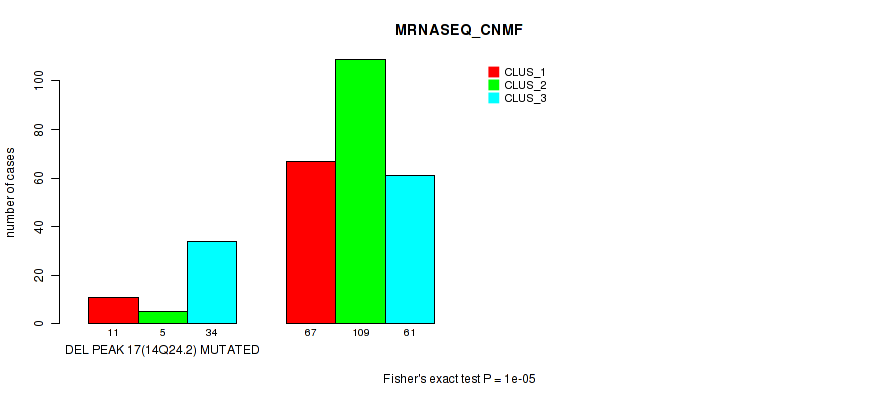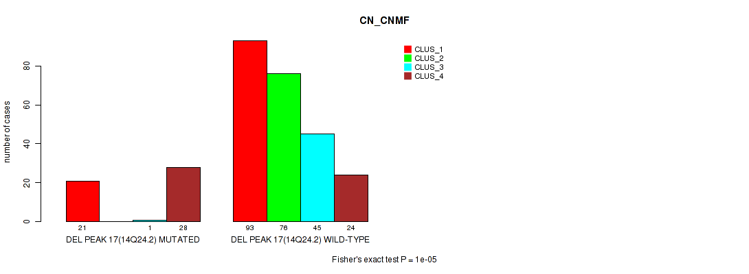del_14q24.2 cnv correlated to 'CN_CNMF', 'MRNASEQ_CNMF', and 'MRNASEQ_CHIERARCHICAL'.