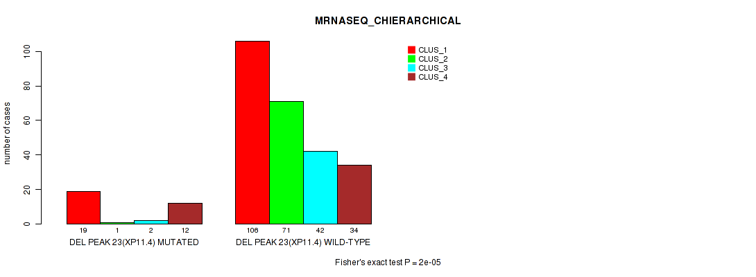Figure S97. Get High-res Image Gene #30: 'del_xp11.4' versus Molecular Subtype #10: 'MIRSEQ_MATURE_CHIERARCHICAL'