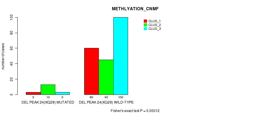 Table S99. Gene #31: 'del_xq28' versus Molecular Subtype #2: 'METHLYATION_CNMF'