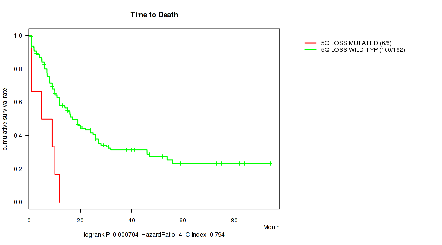Table S1. Gene #18: '5q loss' versus Clinical Feature #1: 'Time to Death'