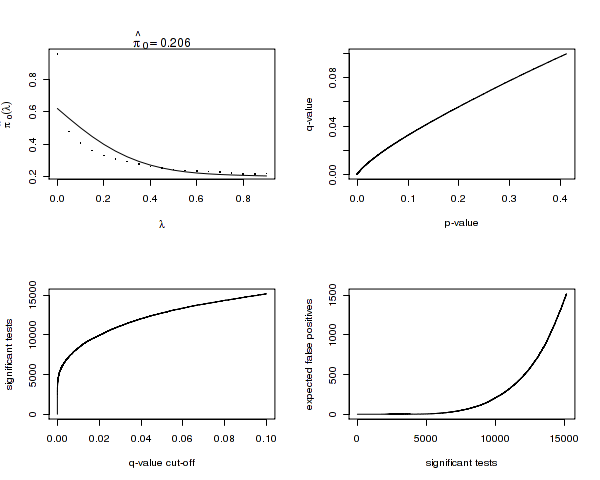 Figure 2. Plot 1. The estimated pi_0 versus the tuning parameter lambda. Plot 2. The q-values versus the p-values. Plot 3. The number of significant tests versus each q-value cutoff. Plot 4. The number of expected false positives versus the number of significant tests.The first is a plot of the estimate of pi_0 versus its tuning parameter lambda. In most cases, as lambda gets larger, the bias of the estimate decreases, yet the variance increases. Comparing your estimate of pi_0 to this plot allows one to guage its quality. The remaining three plots show how many tests are significant, as well as how many false positives to expect for each q-value cut-off.