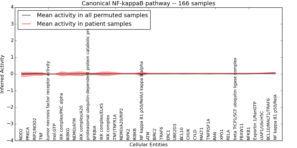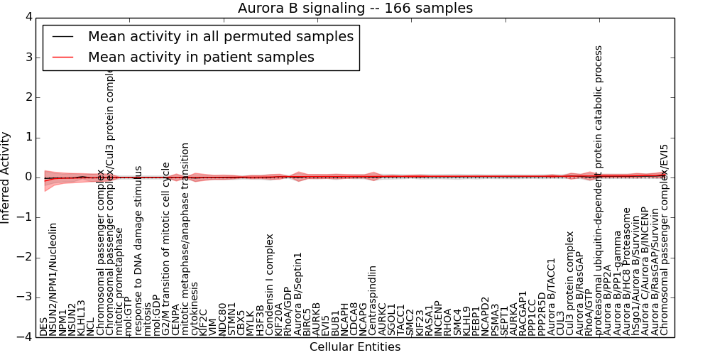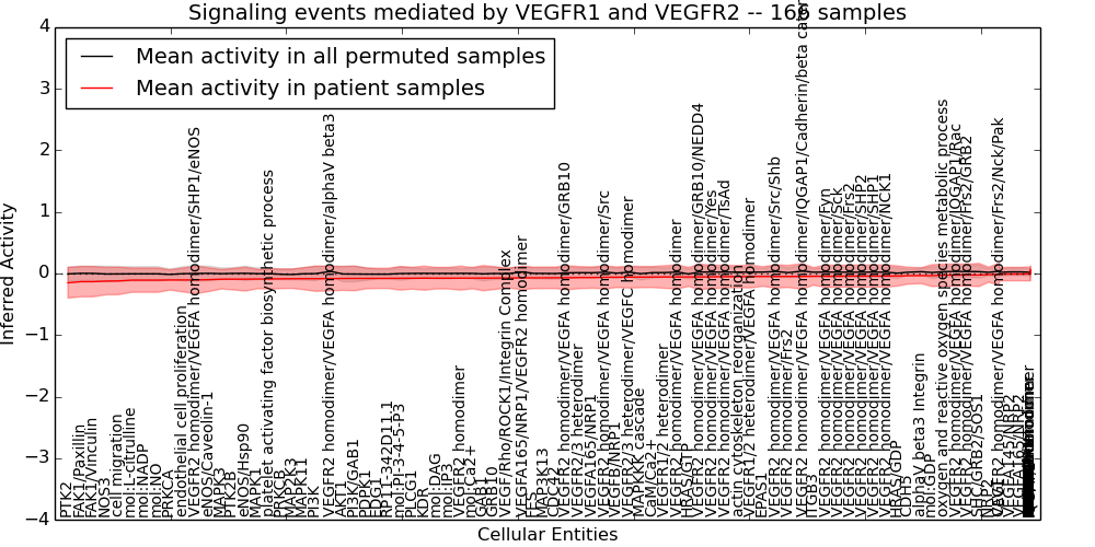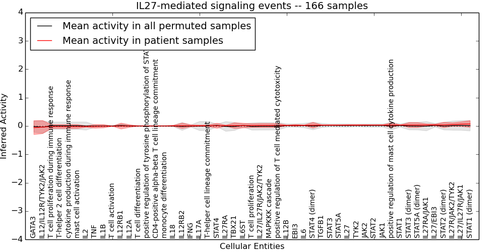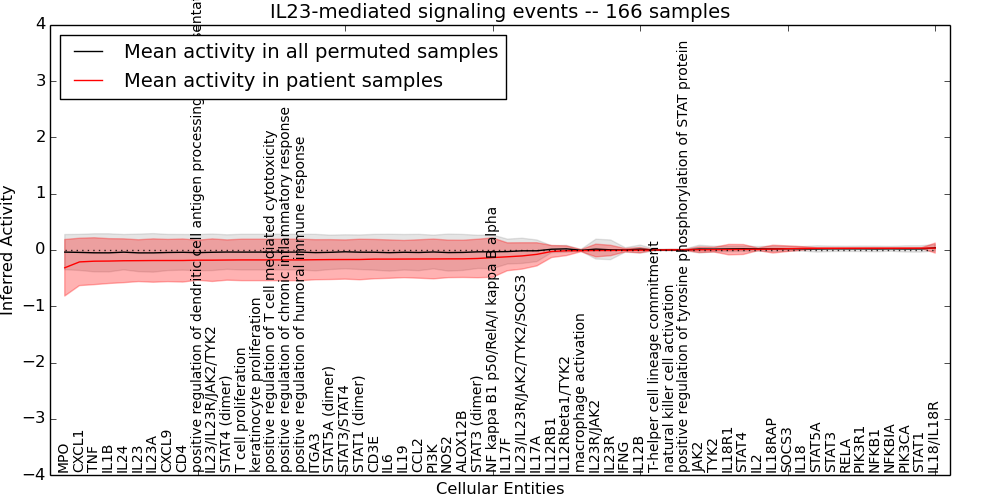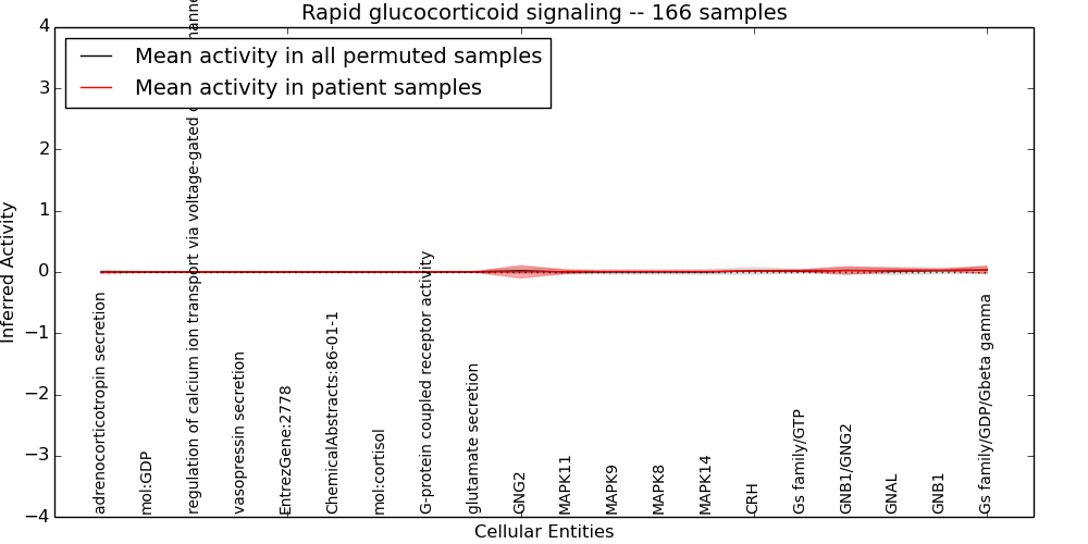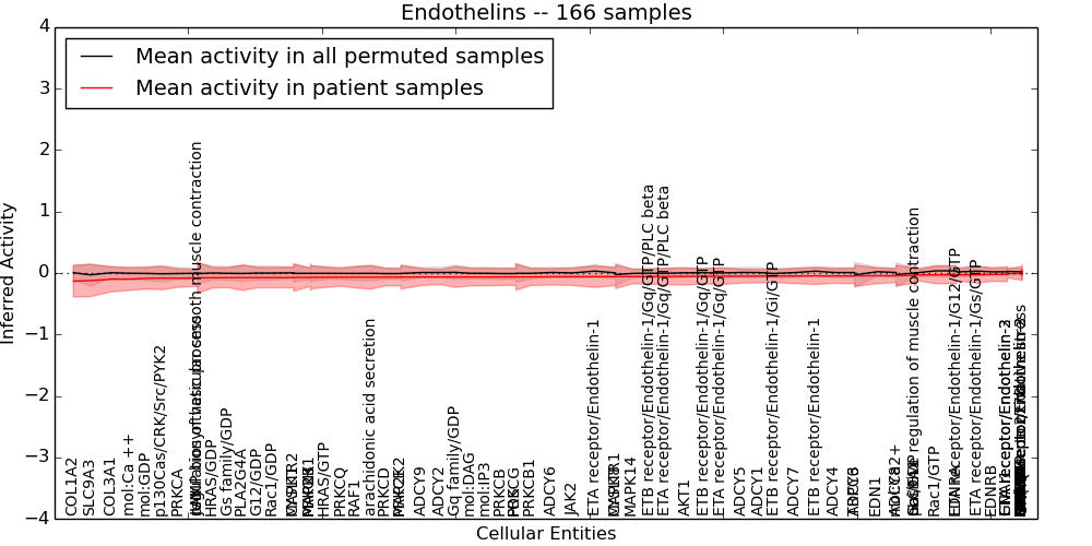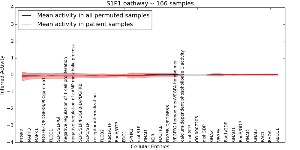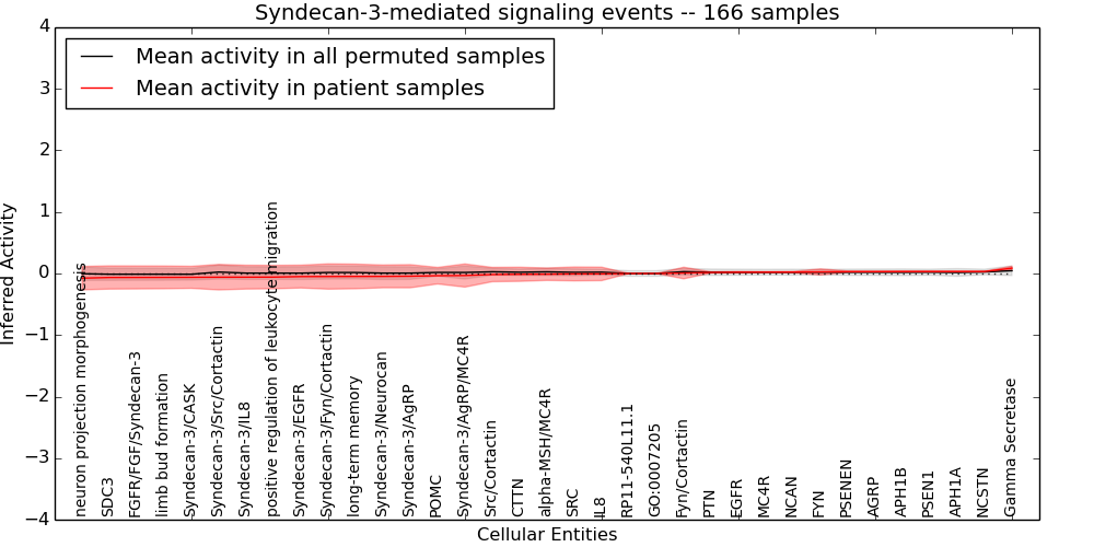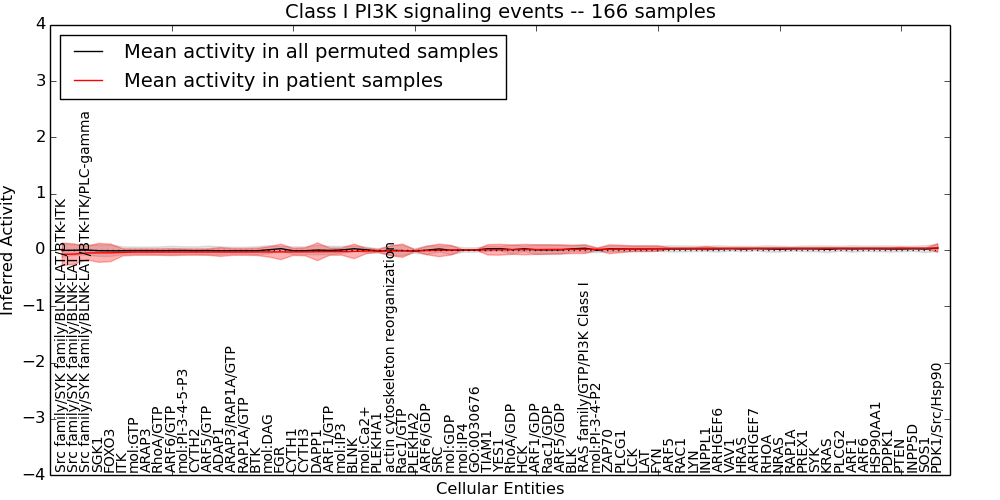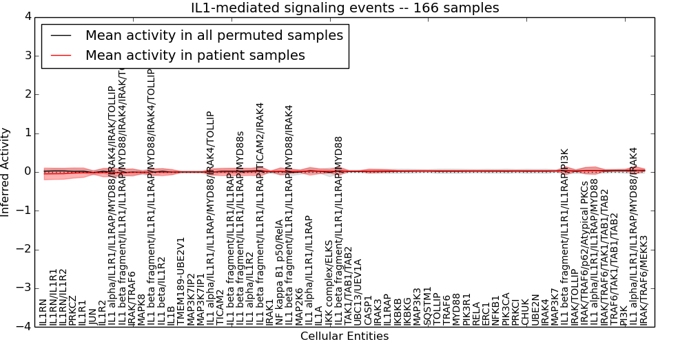 Figure S128. Get High-res Image This plot shows pathway concept perturbations across all samples against a permutation model. The concepts along the x-axis are sorted by lowest to highest mean activity for the real patient samples. Mean inferred activities are plotted along the y-axis as a colored band showing the average level and one standard deviation range. Real samples are shown in red and permuted samples in black.
