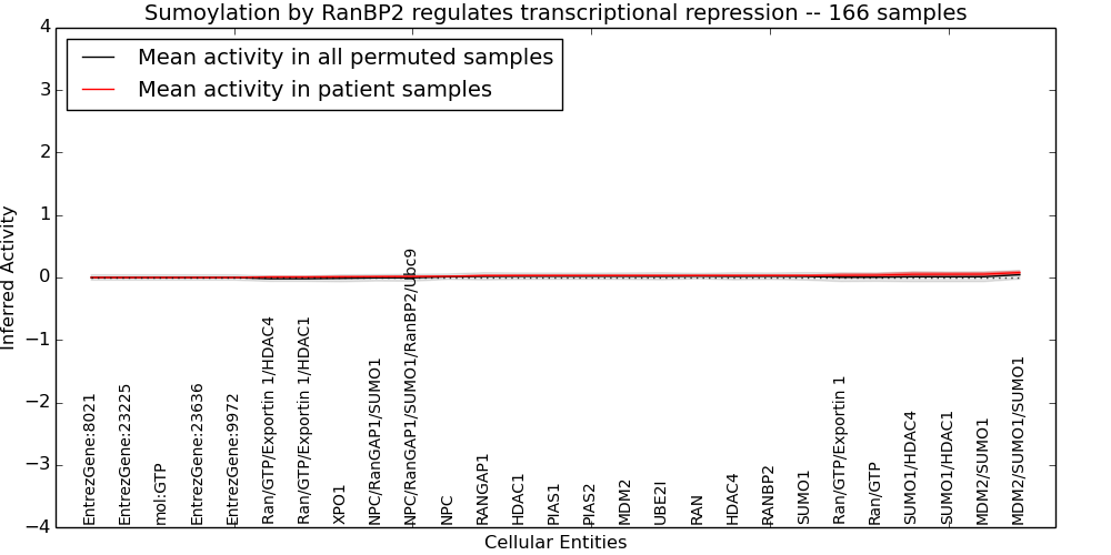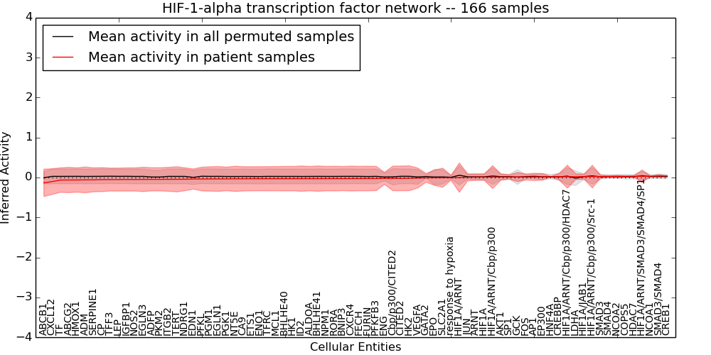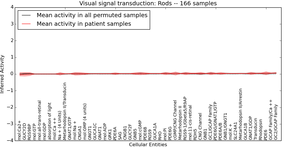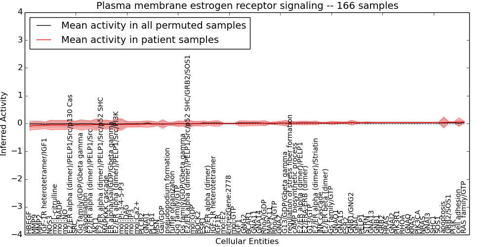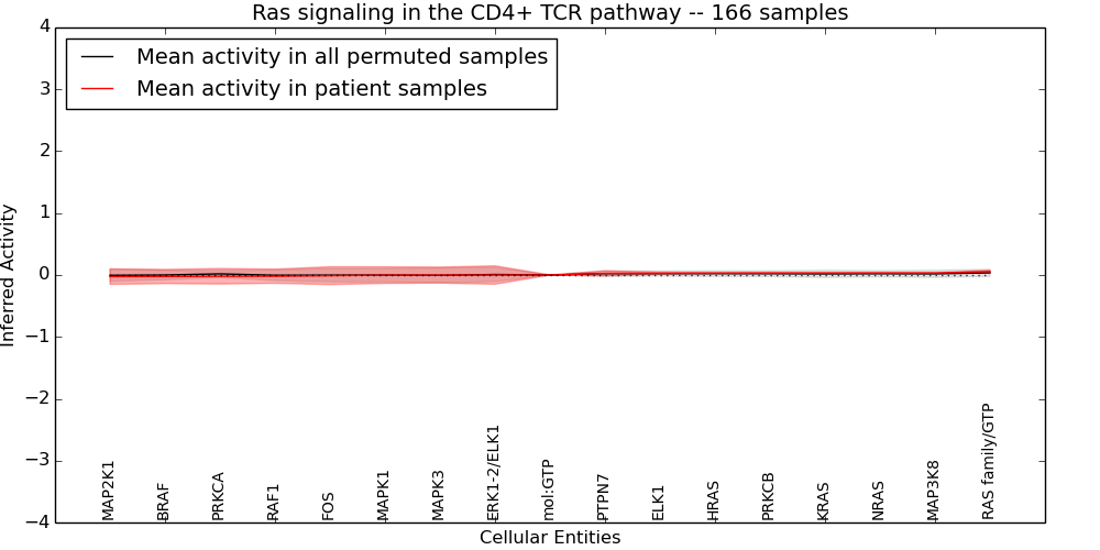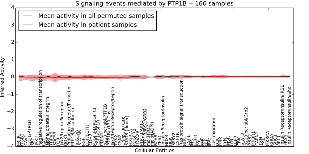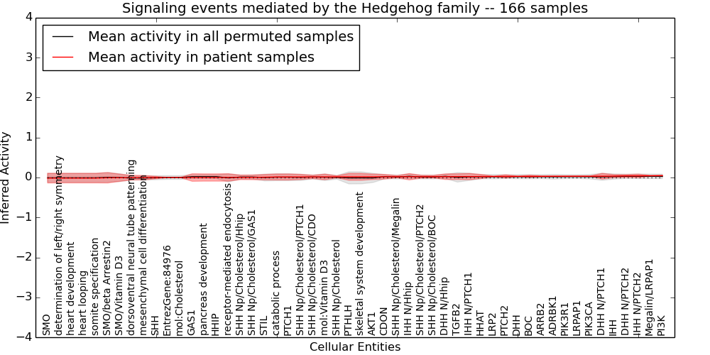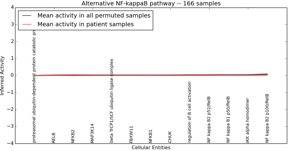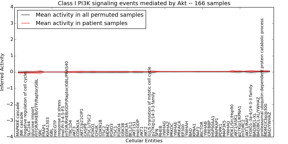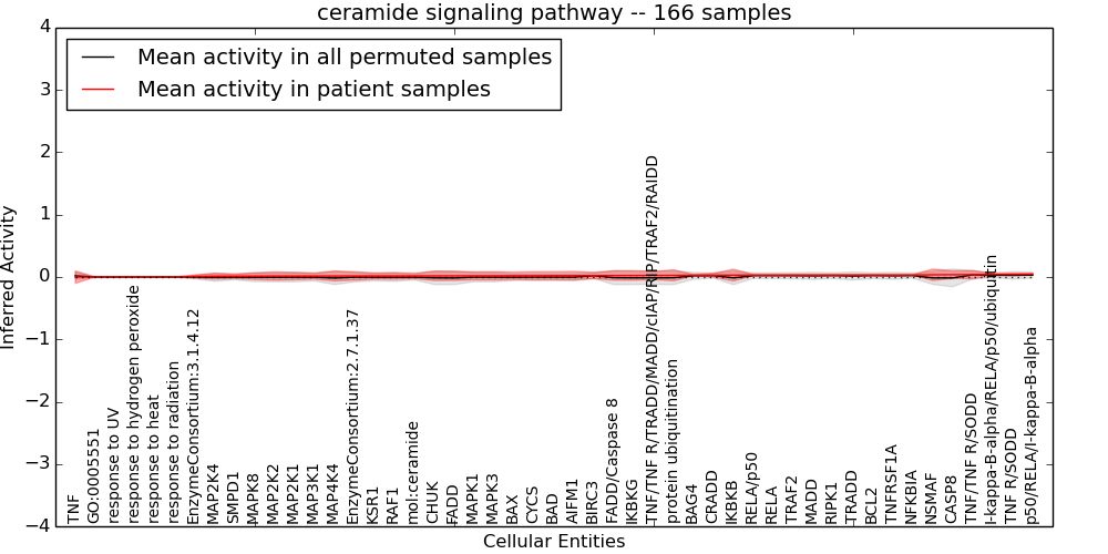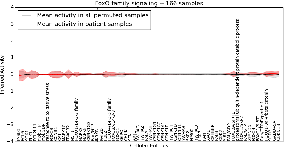 Figure S128. Get High-res Image This plot shows pathway concept perturbations across all samples against a permutation model. The concepts along the x-axis are sorted by lowest to highest mean activity for the real patient samples. Mean inferred activities are plotted along the y-axis as a colored band showing the average level and one standard deviation range. Real samples are shown in red and permuted samples in black.