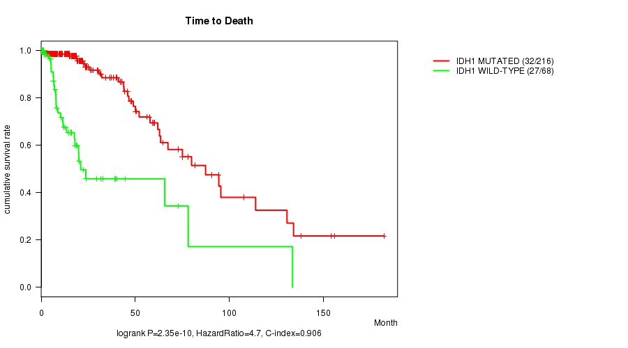 IDH1 mutation correlated to 'Time to Death' and 'AGE'.