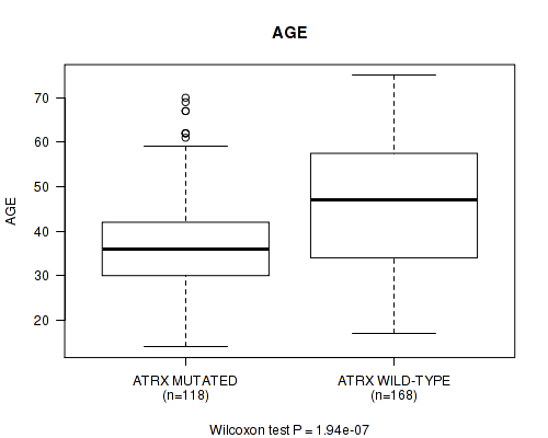 Table S5. Gene #3: 'ATRX MUTATION STATUS' versus Clinical Feature #2: 'AGE'
