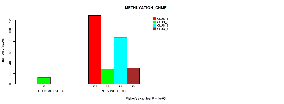 PTEN mutation correlated to 'CN_CNMF', 'METHLYATION_CNMF', 'RPPA_CNMF', 'MRNASEQ_CNMF', 'MRNASEQ_CHIERARCHICAL', 'MIRSEQ_CHIERARCHICAL', 'MIRSEQ_MATURE_CNMF', and 'MIRSEQ_MATURE_CHIERARCHICAL'.