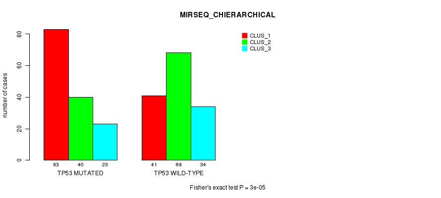 TP53 mutation correlated to 'CN_CNMF', 'METHLYATION_CNMF', 'MRNASEQ_CNMF', 'MRNASEQ_CHIERARCHICAL', 'MIRSEQ_CNMF', 'MIRSEQ_CHIERARCHICAL', and 'MIRSEQ_MATURE_CHIERARCHICAL'.