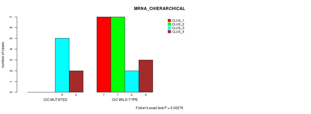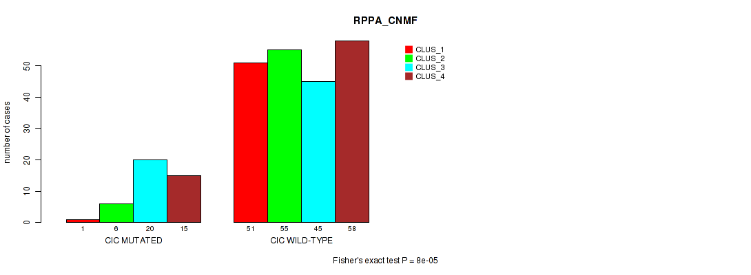 CIC mutation correlated to 'CN_CNMF', 'METHLYATION_CNMF', 'RPPA_CNMF', 'MRNASEQ_CNMF', 'MRNASEQ_CHIERARCHICAL', 'MIRSEQ_CNMF', 'MIRSEQ_CHIERARCHICAL', 'MIRSEQ_MATURE_CNMF', and 'MIRSEQ_MATURE_CHIERARCHICAL'.