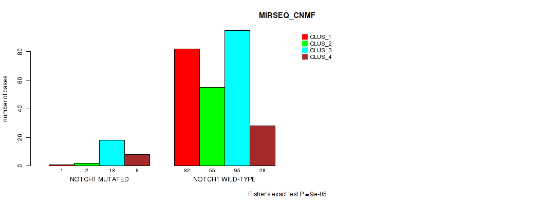 NOTCH1 mutation correlated to 'CN_CNMF', 'METHLYATION_CNMF', 'MRNASEQ_CNMF', 'MRNASEQ_CHIERARCHICAL', 'MIRSEQ_CNMF', 'MIRSEQ_CHIERARCHICAL', 'MIRSEQ_MATURE_CNMF', and 'MIRSEQ_MATURE_CHIERARCHICAL'.