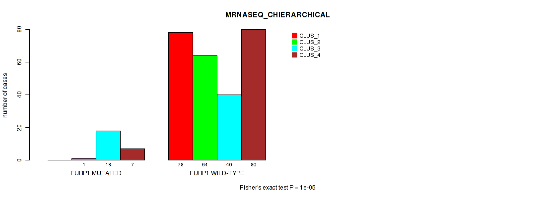 FUBP1 mutation correlated to 'CN_CNMF', 'METHLYATION_CNMF', 'MRNASEQ_CNMF', 'MRNASEQ_CHIERARCHICAL', 'MIRSEQ_CNMF', and 'MIRSEQ_MATURE_CHIERARCHICAL'.