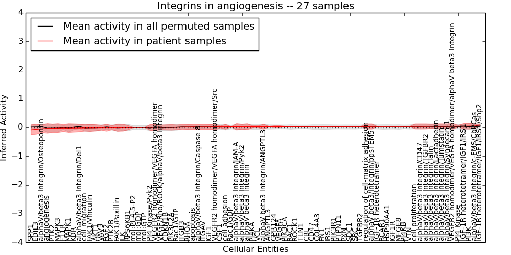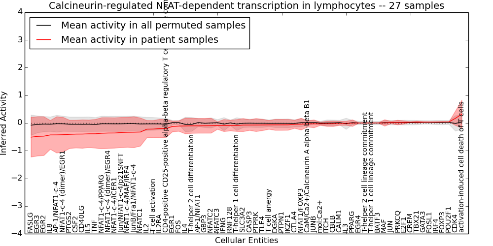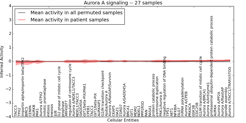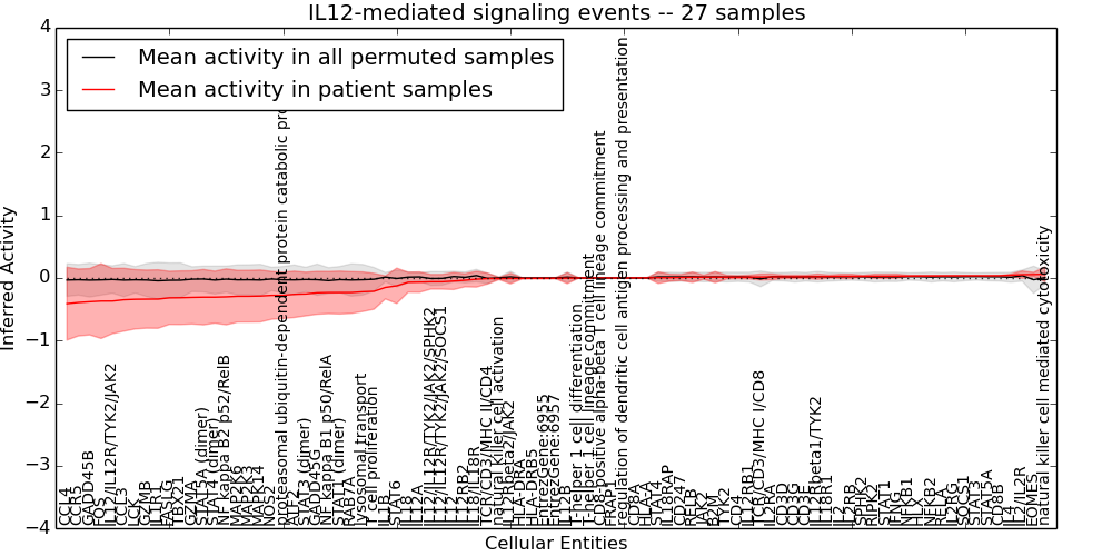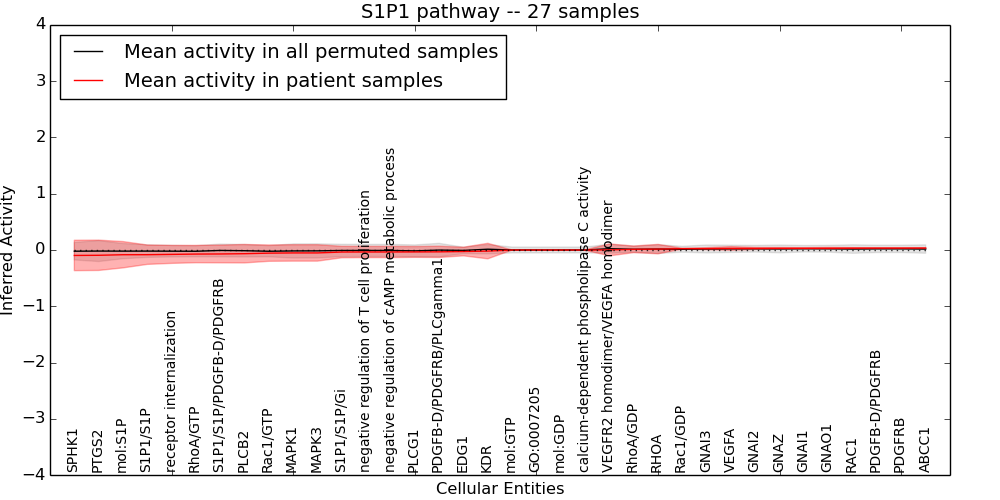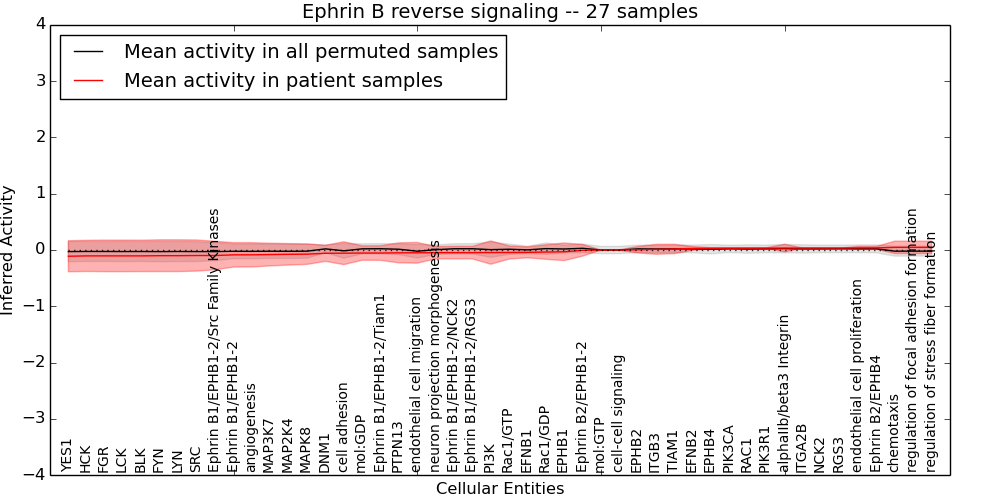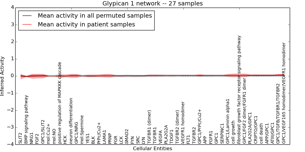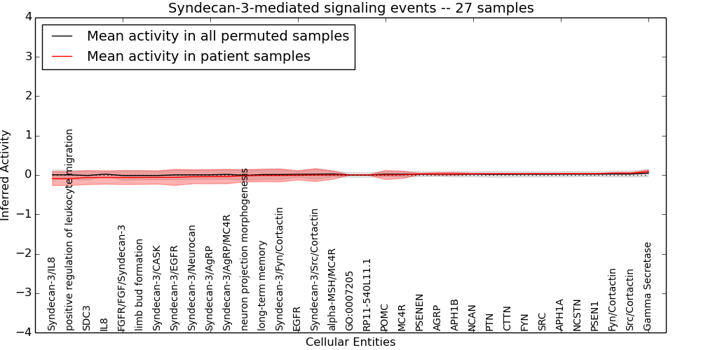 Figure S131. Get High-res Image This plot shows pathway concept perturbations across all samples against a permutation model. The concepts along the x-axis are sorted by lowest to highest mean activity for the real patient samples. Mean inferred activities are plotted along the y-axis as a colored band showing the average level and one standard deviation range. Real samples are shown in red and permuted samples in black.