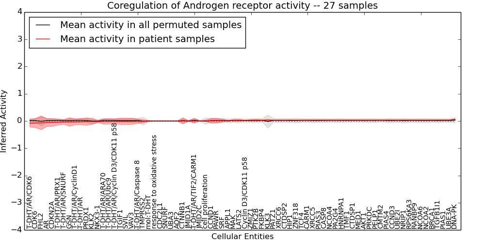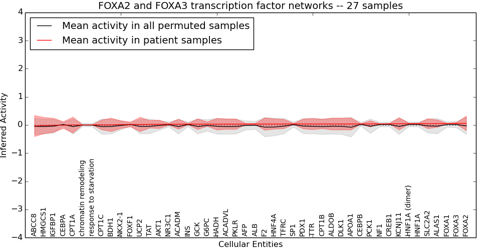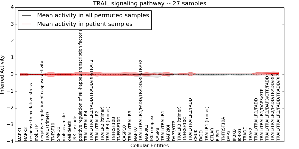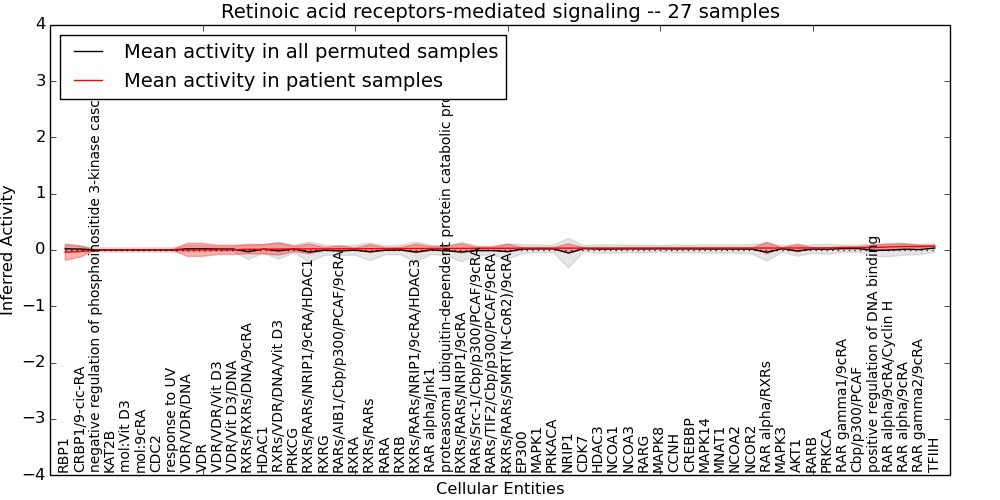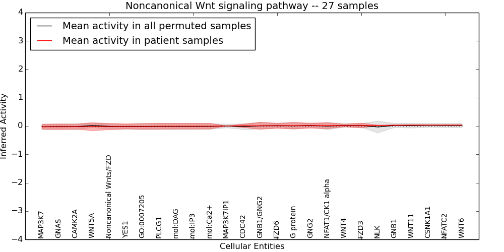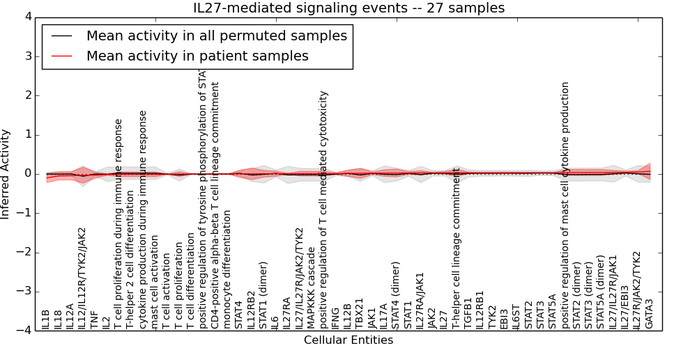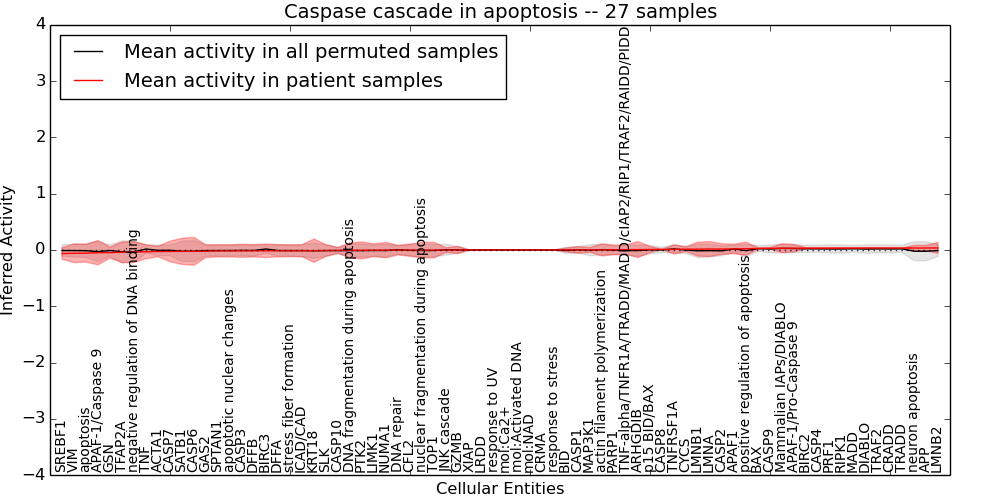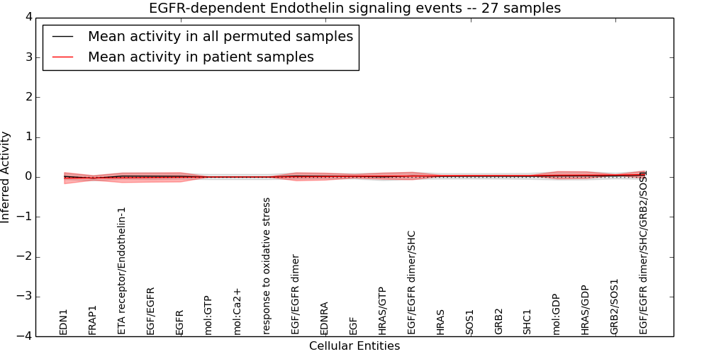 Figure S131. Get High-res Image This plot shows pathway concept perturbations across all samples against a permutation model. The concepts along the x-axis are sorted by lowest to highest mean activity for the real patient samples. Mean inferred activities are plotted along the y-axis as a colored band showing the average level and one standard deviation range. Real samples are shown in red and permuted samples in black.