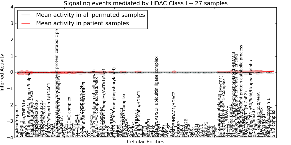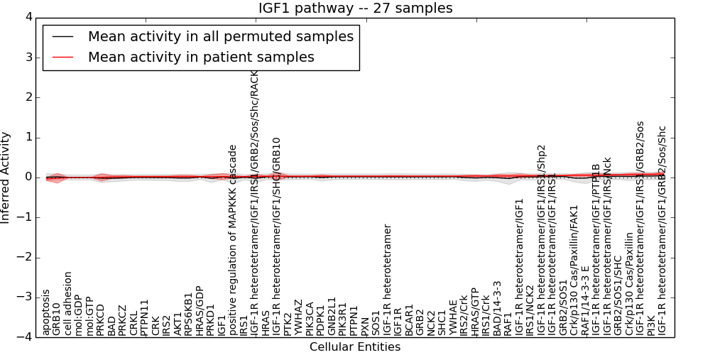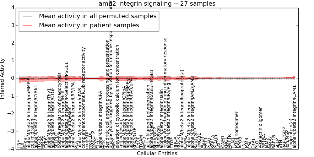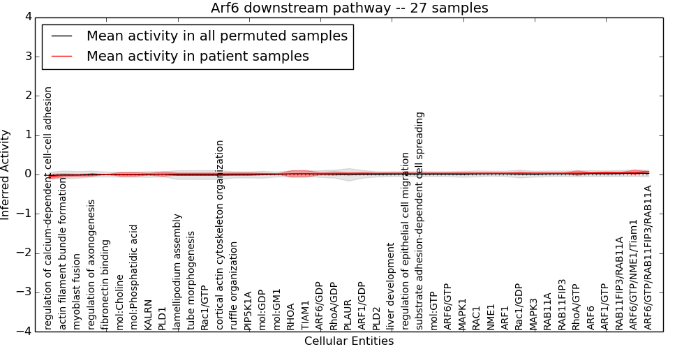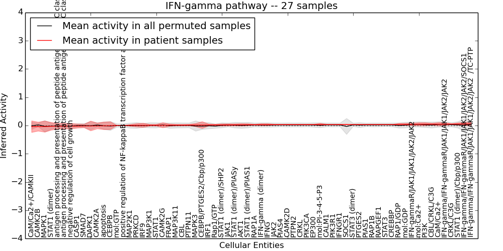 Figure S130. Get High-res Image This plot shows pathway concept perturbations across all samples against a permutation model. The concepts along the x-axis are sorted by lowest to highest mean activity for the real patient samples. Mean inferred activities are plotted along the y-axis as a colored band showing the average level and one standard deviation range. Real samples are shown in red and permuted samples in black.