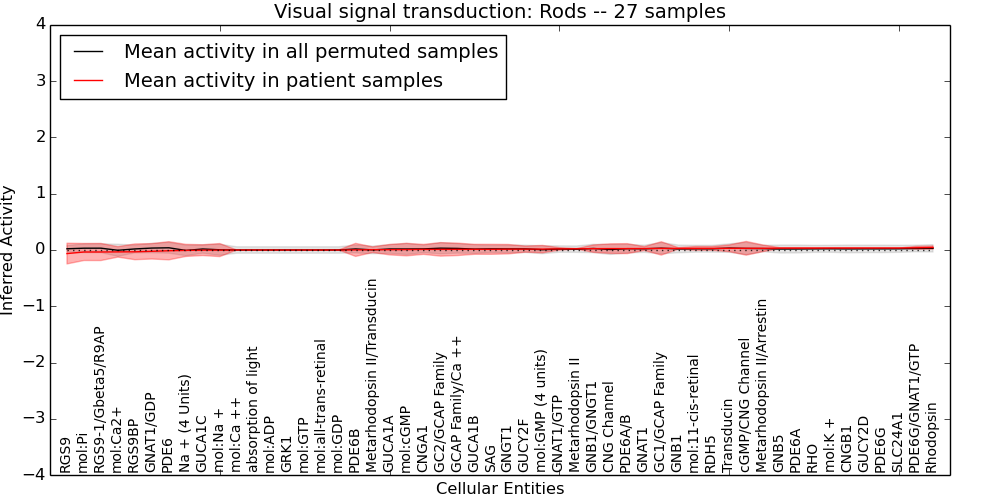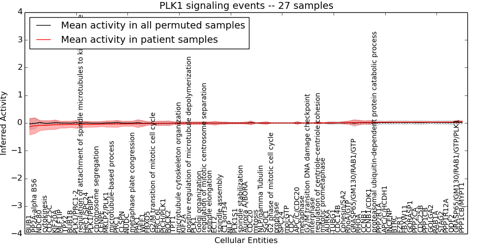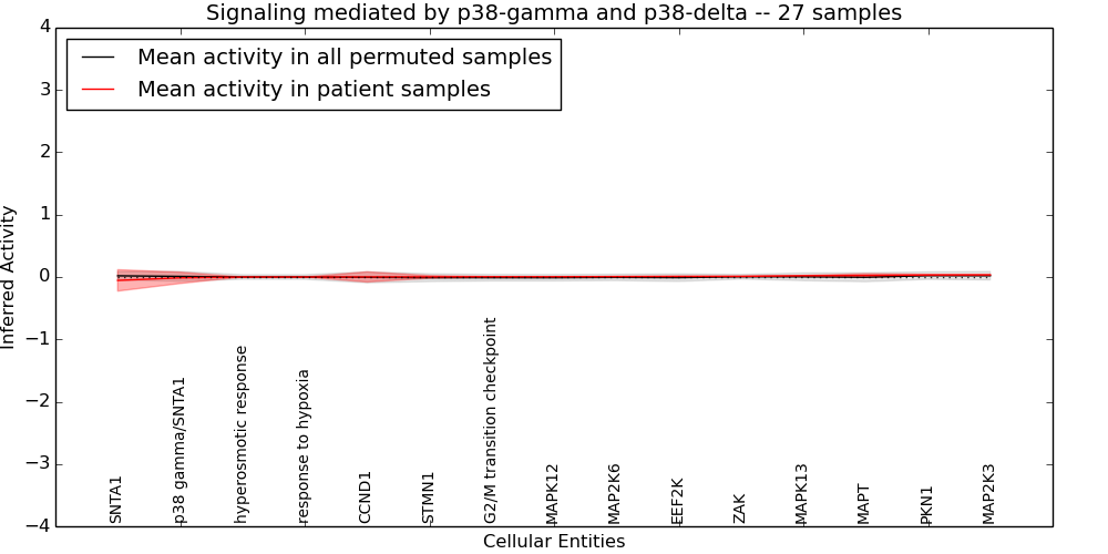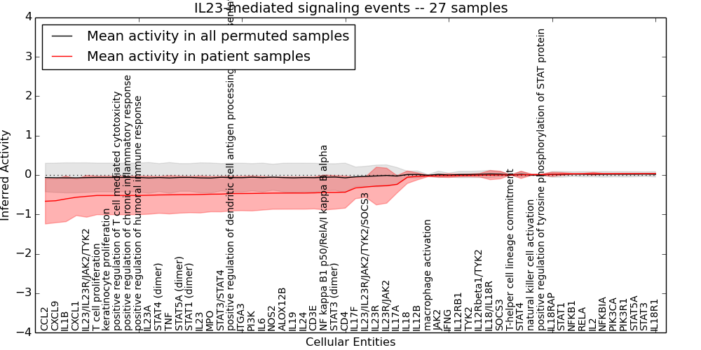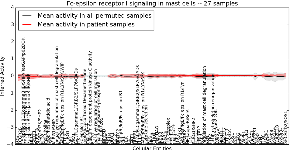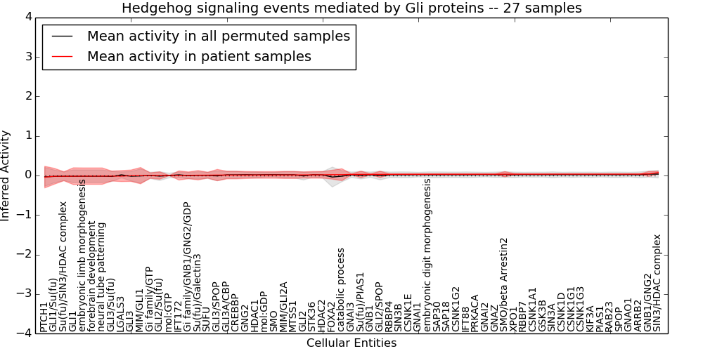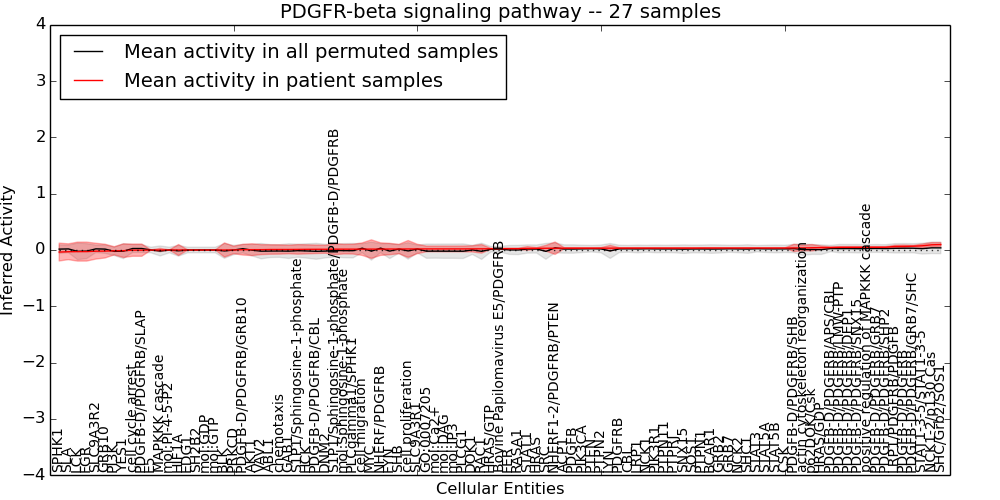 Figure S131. Get High-res Image This plot shows pathway concept perturbations across all samples against a permutation model. The concepts along the x-axis are sorted by lowest to highest mean activity for the real patient samples. Mean inferred activities are plotted along the y-axis as a colored band showing the average level and one standard deviation range. Real samples are shown in red and permuted samples in black.