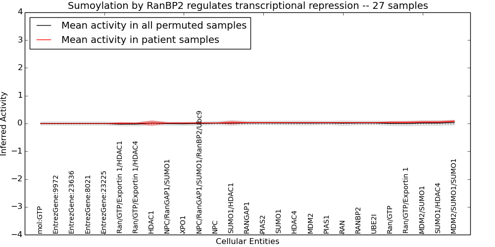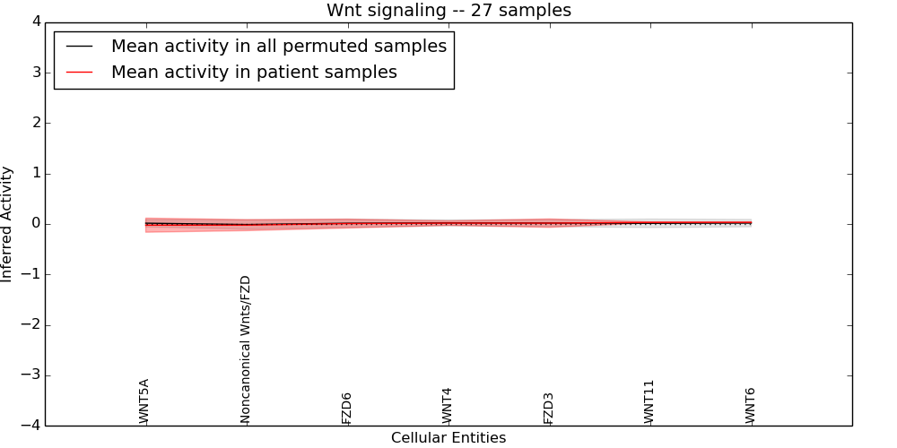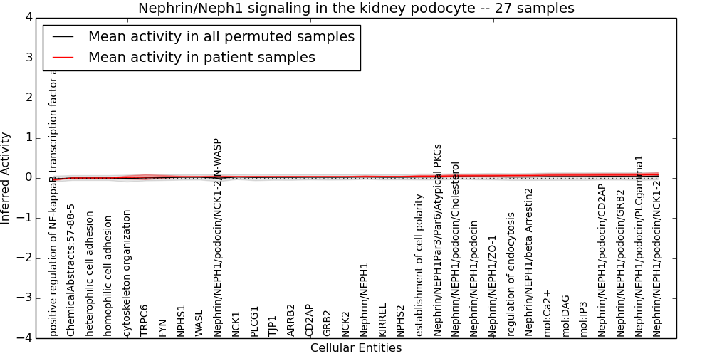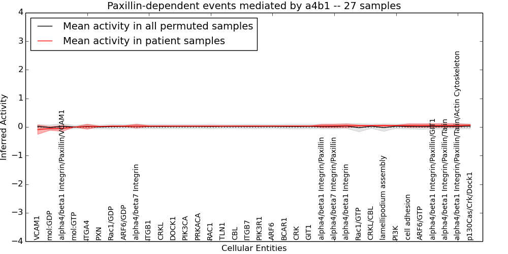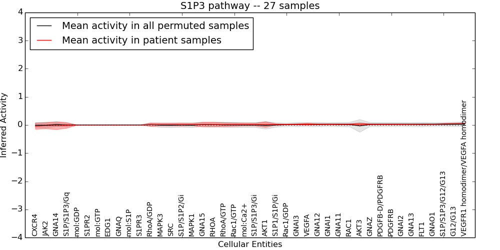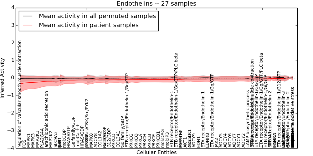Figure S130. Get High-res Image This plot shows pathway concept perturbations across all samples against a permutation model. The concepts along the x-axis are sorted by lowest to highest mean activity for the real patient samples. Mean inferred activities are plotted along the y-axis as a colored band showing the average level and one standard deviation range. Real samples are shown in red and permuted samples in black.