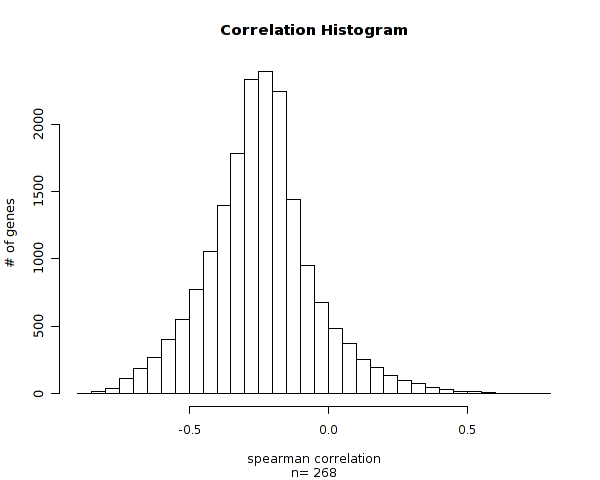 Figure 1. Histogram of methylation correlation values. n is the number of matched samples between Level 3 CpG site methylation and Level 3 gene expression arrays. Number of Matched Samples = 268