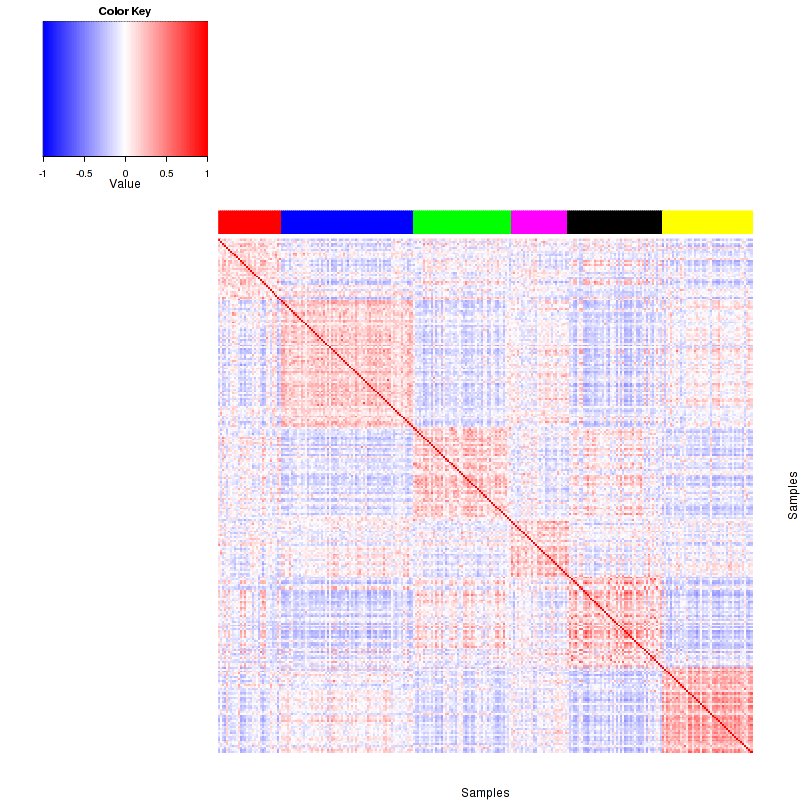 Figure 1. Get High-res Image Samples were separated into 6 clusters. Shown are 268 samples and 1800 marker genes. The color bar of the row indicates the marker genes for the corresponding cluster.
