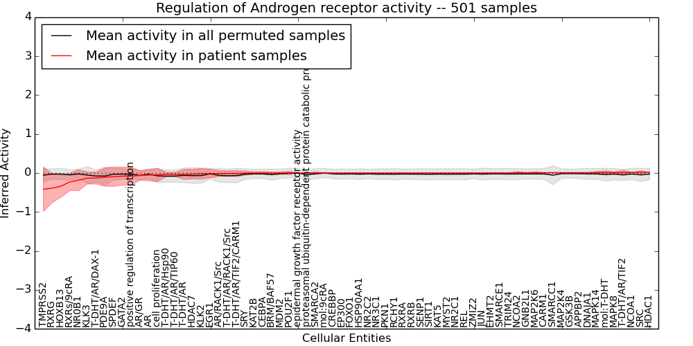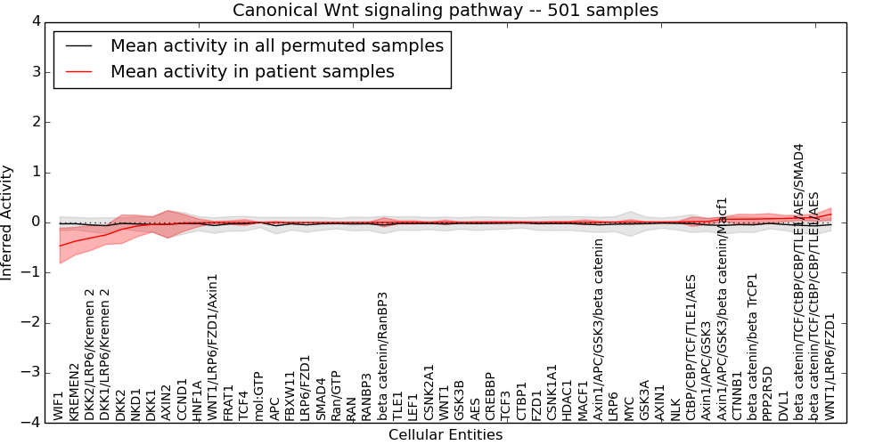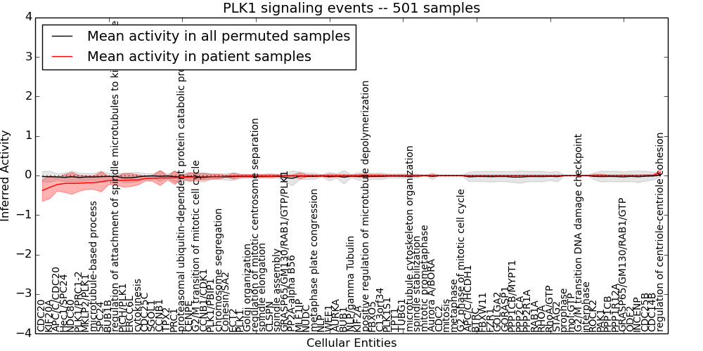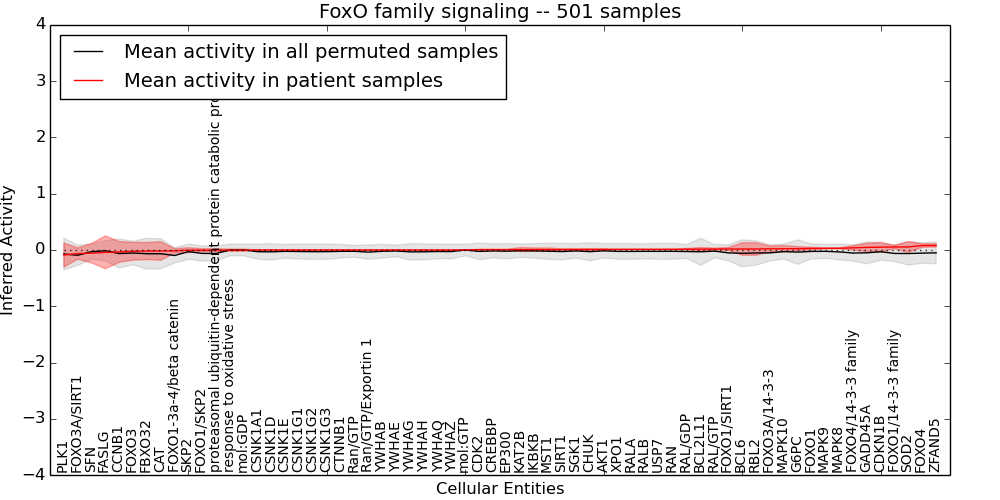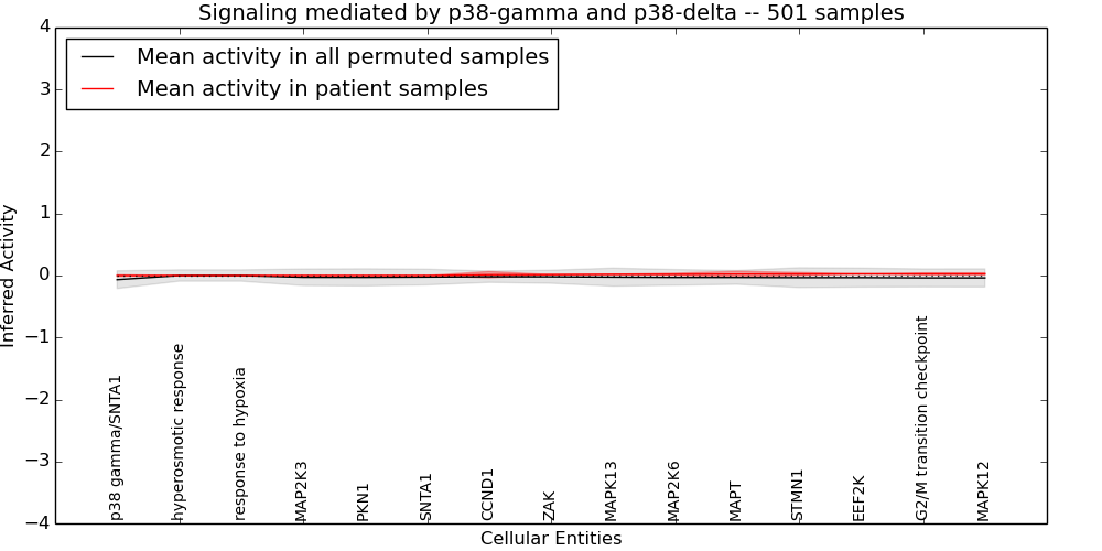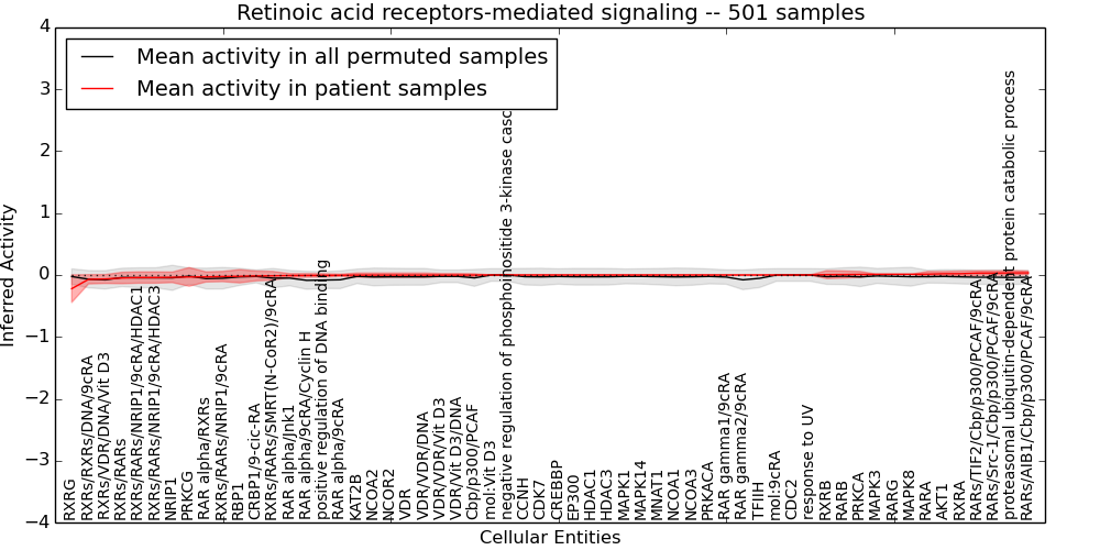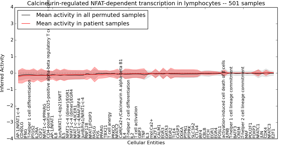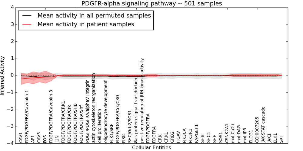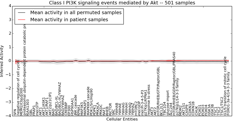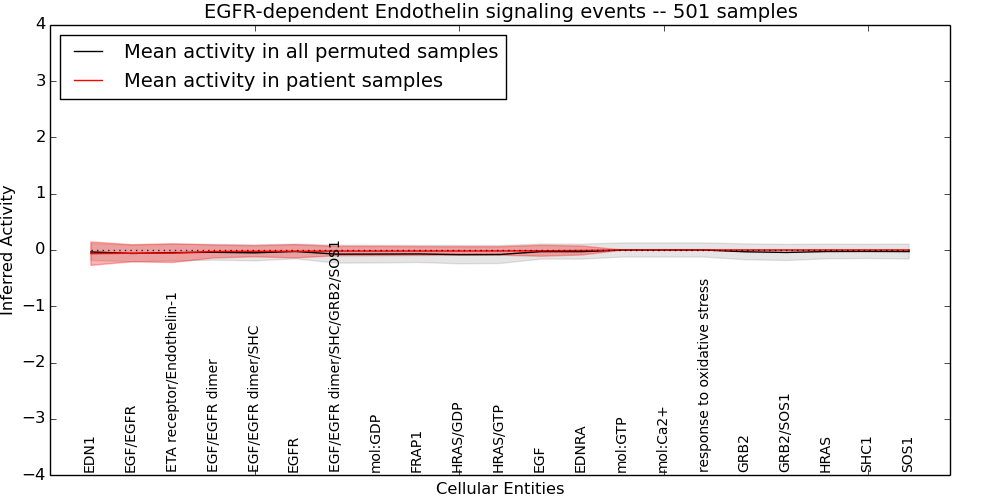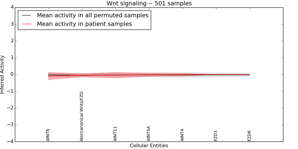 Figure S131.  Get High-res Image This plot shows pathway concept perturbations across all samples against a permutation model. The concepts along the x-axis are sorted by lowest to highest mean activity for the real patient samples. Mean inferred activities are plotted along the y-axis as a colored band showing the average level and one standard deviation range. Real samples are shown in red and permuted samples in black.